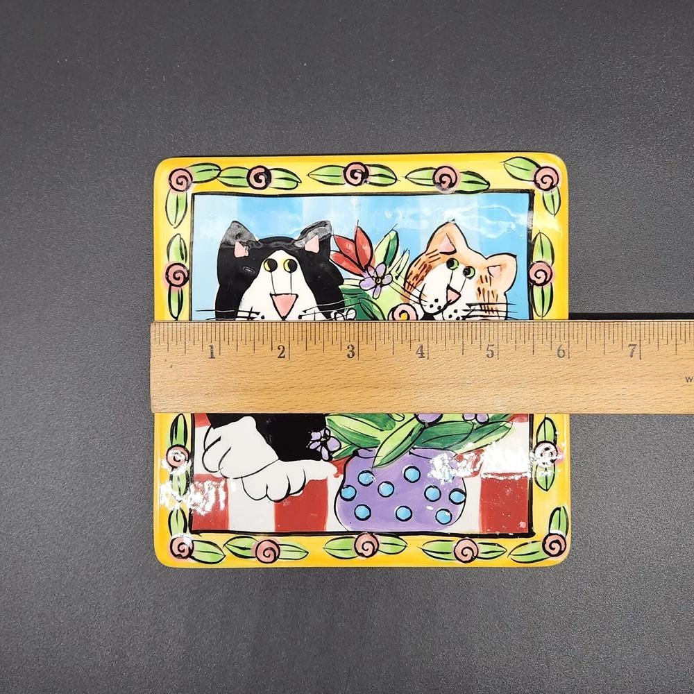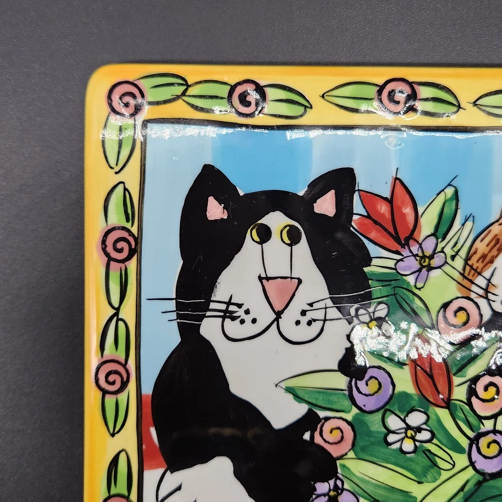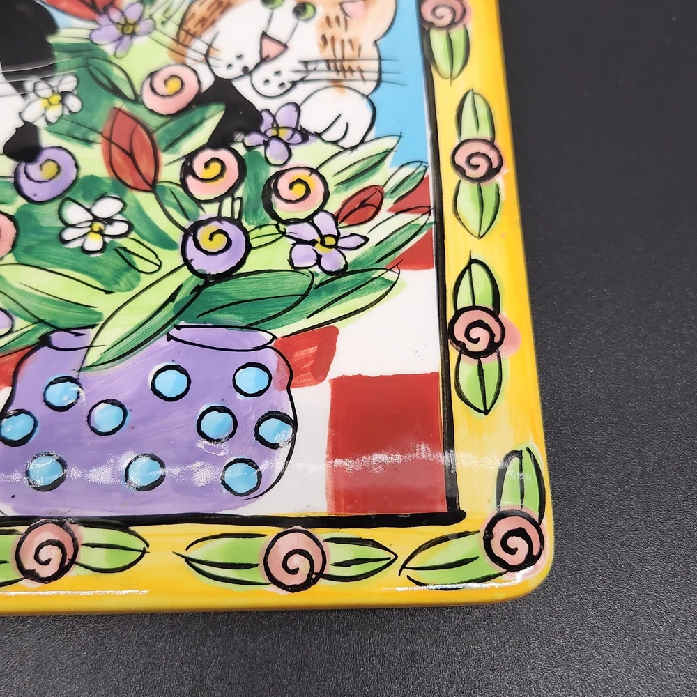 This square plate/trivet is like a feline sitcom, starring two mischievous cats in the middle of an epic floral heist. Whether you're a cat lover or simply enjoy quirky decor, this plate adds a splash of humor and color to any setting. • Made of durable ceramic • Features colorful cat and floral design • Measures 6 inches by 6 inches • Designed by Candace Reiter • Hand wash recommended Used but in very good condition. No chips or cracks. See photos for details.