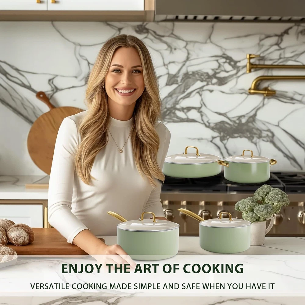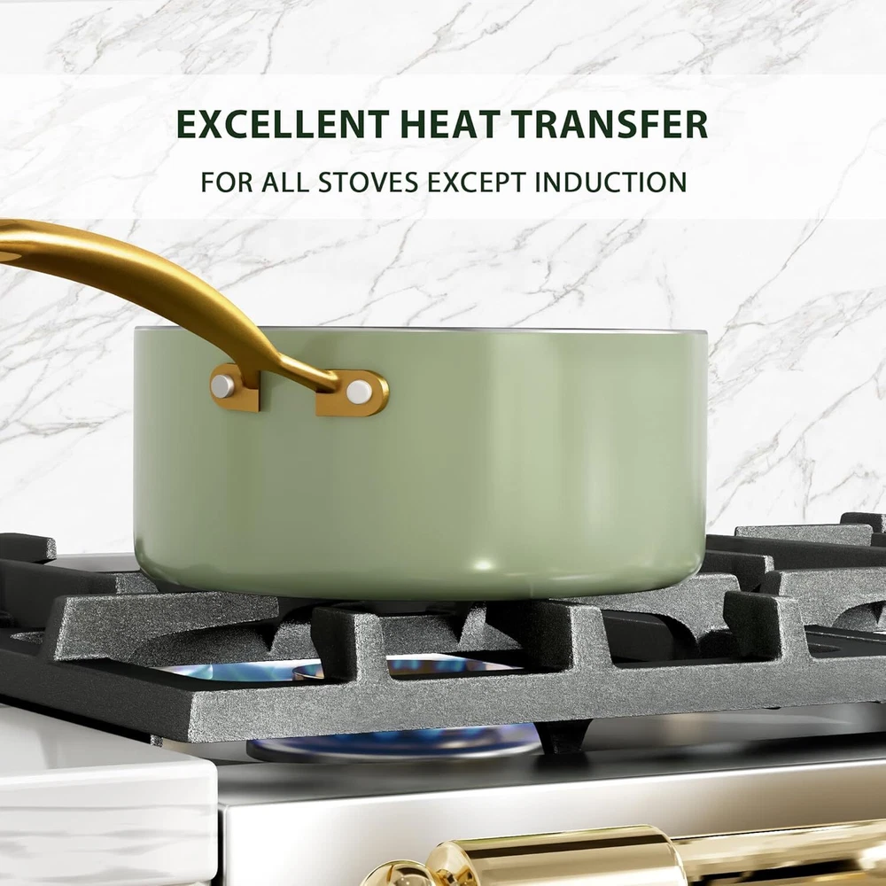 【What's in The Box: Our 16-piece pots and pans set nonstick includes 8" and 10" nonstick frying pans, 5 qt. dutch oven with lid, 1.7 qt. and 2.5 qt. saucepan set with lid, 11" sauté pan with lid, 5 pcs silicone kitchen utensils set and 1 pcs storage bucket. The stylish kitchen cookware sets meet all your kitchen and family needs. Stylish Flair & Best Gift Ideas: The double rivet link design provides a safe and secure grip, and kitchen pan set's unique and eye-catching matte metallic color enhances the artistry of your kitchen, and when you use these apartment essentials, you're more in the mood to prepare every meal. wedding gifts, bridal shower gifts, housewarming gift, Christmas gift, etc. gifts for mom, your friends and family. For all Stovetops Except Induction: The nonstick cookware set does not have a magnetic induction bottom, which allows faster heating on other cooktops, saving time and energy. Plus, oven safe up to 550°, making cooking pot set nonstick great for bread baking and roasts. Naturally Nonstick: No more sticky or difficult-to-clean problems. The Ceramic Cookware Set require less oil or butter for cooking and minimal scrubbing for a spotlessly clean, giving you a healthy and easy at-home culinary experience. On Dec 15, 2024 at 18:42:54 PST, seller added the following information: