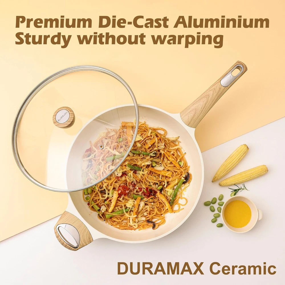 Healthy Ceramic Cookware Sets - SGS approved. Non-toxic, free of PTFE, PFAS, PFOA, PFOS, APEO, lead, cadmium and other toxic substances that can leach into food. Naturall Nonstick - Ceramic non-stick is healthier and scratch-resistant with excellent food release. Only less oil is needed for cooking, for a healthy, low-fat diet. 14 Piece Pots and Pans Set Includes - 8 & 9.5 inch frying pan set, 12inch/5Qt saute pan with lid, 6.5Qt casserole with lid, 2Qt saucepan with lid, 2pcs multi-purpose utensils, 4pcs pot protectors. Induction Compatible - 4.8mm thick stainless steel pan bottom makes this cookware set suitable for all stovetops. Die-cast aluminum construction allows the pan to heat up quickly and evenly, keeping the heat consistent. No warping and durable. Easy to Clean - Simply wipe with a paper towel or rinse with water, hand washing is recommended as it cleans effortlessly. Stay-Cool Handle & Glass Lid - The anti-scald wood-grain Bakelite handle is ergonomically designed for comfort and ease of handling. The explosion-proof glass lid prevents splashing and ensures maximum visibility. Product Description Why Choose Sensarte Ceramic Cookware Sets? SAFE & HEALTHY - Natural ceramic surface , 100% free of PTFE, PFAS, PFOA, PFOS, APEO, lead, cadmium, and other heavy metals. Healthier than Teflon coated pans. PREMIUM CORROSION RESISTANCE - Harder surface and stronger adhesion provide a stronger barrier for better protection of pans. HIGH HEAT RESISTANCE - Performs well in thermal shock tests. Does not produce toxic fumes even when overheated. LONG LASTING DURABILITY - Scratch-resistant, abrasion-resistant, maintains good non-stick performance even after years of use. EASY TO CLEAN - Rivet-free design and premium non-stick technology make cleaning a breeze. DIE-CAST CONSTRUCTION- Heavy duty, strong and durable, no warping. Stands up to daily use. SPACE SAVING - Stacks and hangs to save space. 1 Perfect Food Release 2 Easy to Clean 3 Space Saving 1 12in/5Qt Saute Pan w/ Lid 2 6.5 Qt Casserole w/ Lid 3 8 & 9.5 Inch Fring Pan 4 2 Qt Sauce Pan w/ Lid 5 Utensil & Pan Protectors 1 What's Included 2 12" saute pan & Stock Pan 3 8" & 9.5" Frying Pan 4 2Qt Saucepan & Utensil 1 Anti-scald Handles 2 Suitable For All Stoves 3 Explosion-Proof Glass Lid 4 Thoughtful Helper