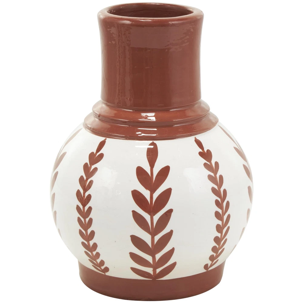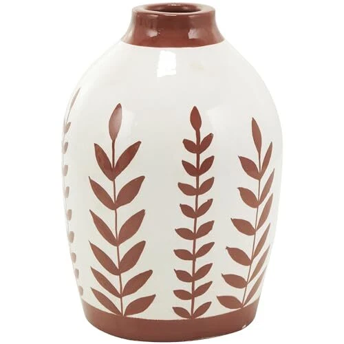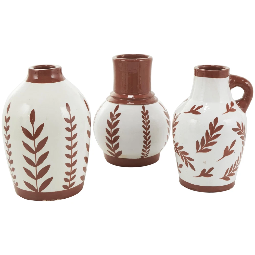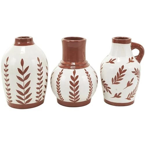 The Tuscan set of 3 vases for home decor showcases meticulous craftsmanship, each molded into a distinct shape and uniquely painted. The round shape and leaf designs of these polished white vases for faux flowers offers a classic and timeless look, while vase has a little handle for added charm. Wipe clean with a dry cloth. Style the floral set of 3 centerpiece vases together as a cluster on a dining table or separately in different areas of the home, enhancing visual appeal. Designed with felt or rubber stoppers at the base that prevent scratching furniture and table tops, as well as sliding around. This item ships in 1 carton. Ceramic vase makes a great gift for any occasion. Suitable for indoor use only. This item ships fully assembled in piece. Made in India. This white colored ceramic vase comes as a set of 3. Tuscan style. Vases have 2.50 in, 1.80 in, and 1.50 in mouth openings. TUSCAN HOME DÉCOR VASES: Immerse yourself in the harmony and beauty of pieces that unite natural textures with ornate details to create that Old World charm CERAMIC VASES FOR CENTERPIECE: Crafted from high-quality terracotta, this white decorative vase set ensures longevity and a polished aesthetic WHITE VASES FOR FLOWERS: This round home decor vases set showcases a soft and soothing terracotta brown with a polished finish over a background of white, adding a touch of freshness to the home FLORAL ROUND VASES FOR HOME DÉCOR: This ceramic set of 3 vases offers a variety of patterns, perfect for creating stunning dried floral arrangements or unique individual display 3 SMALL SIZE FLOWER VASES CENTERPIECE: Each white ceramic vase measures 6.35L x 6.35W x 8.8H , 5.35L x 5.3W x 8.85H, 6.1L x 6.2W x 9.05H inches, and collectively weighs 10.93 lbs