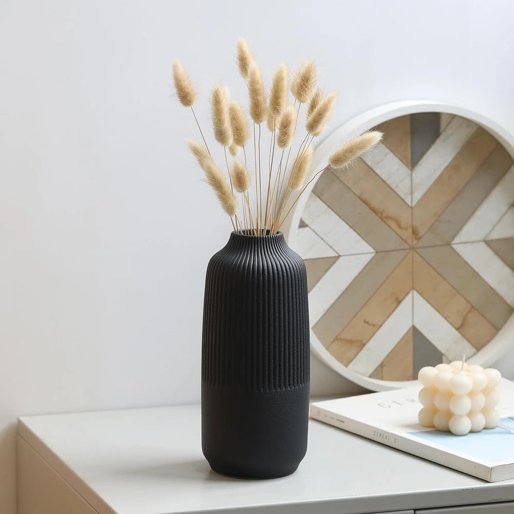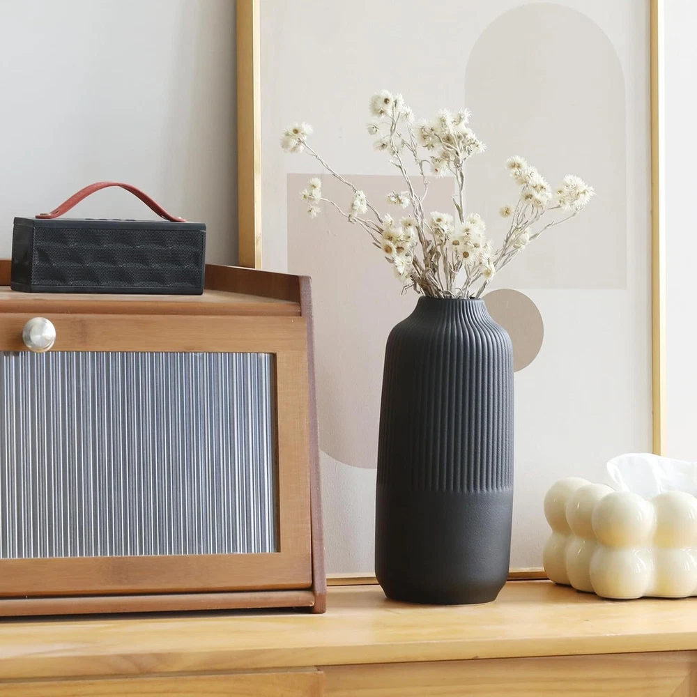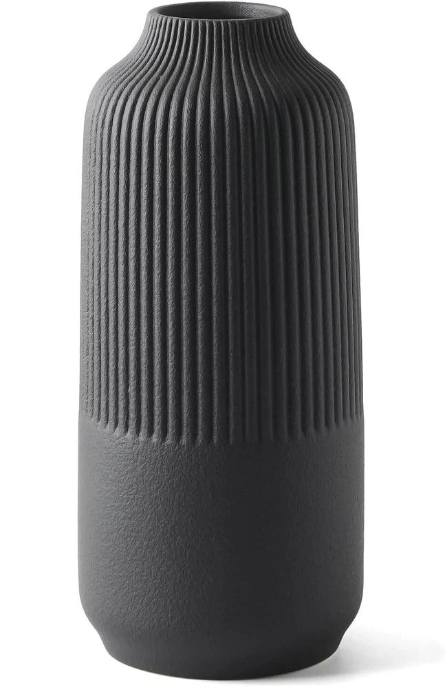 Attractive Ribbed Vase: this home decor vase made of high quality ceramic, it's perfect matte black shade and the etched stripes add a subtle texture. Looks good anywhere, such as living room, bedroom, table, shelf, filled with flowers or pampas grass, adds natural beauty to you space Original Minimalist Vase: designs by combining soft and smooth curves with parallel lines, the matte finish gives it a beautifully sculpted look, so this black vase suitable for all styles: classic, traditional, farmhouse or boho modern decor, create a pretty centerpiece Perfect Size & Idea Gift: this handmade ceramic vase stands 10 inches tall, looks like a piece of art, making it an ideal gift for your family and friends; great gifts for various events such as Birthdays, Valentine's Day, Women's Day, Mother's Day, Christmas, Wedding Well-Crafted & Anti-Scratches: handcrafted from natural ceramic, feels substantial and well-made, promising to stand the test of time. Its wide opening makes it easy to arrange flowers or greenery, while its sturdy base with soft rubber feet ensures stability on any surface Solid Package & Reliable : each vase is securely packed in a sturdy box with polyethylene foam cotton to ensure safe delivery, ready to be wrapped and gifted to a loved ! Please feel free to us if you need any assistance