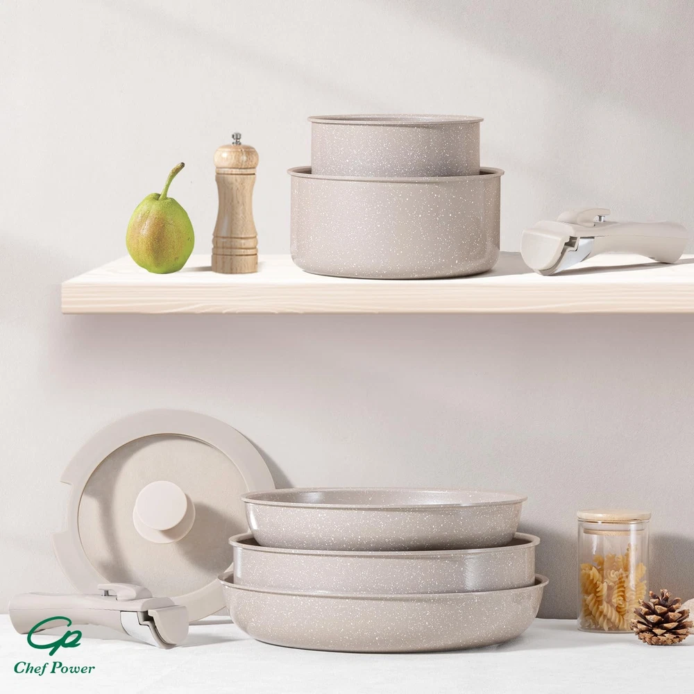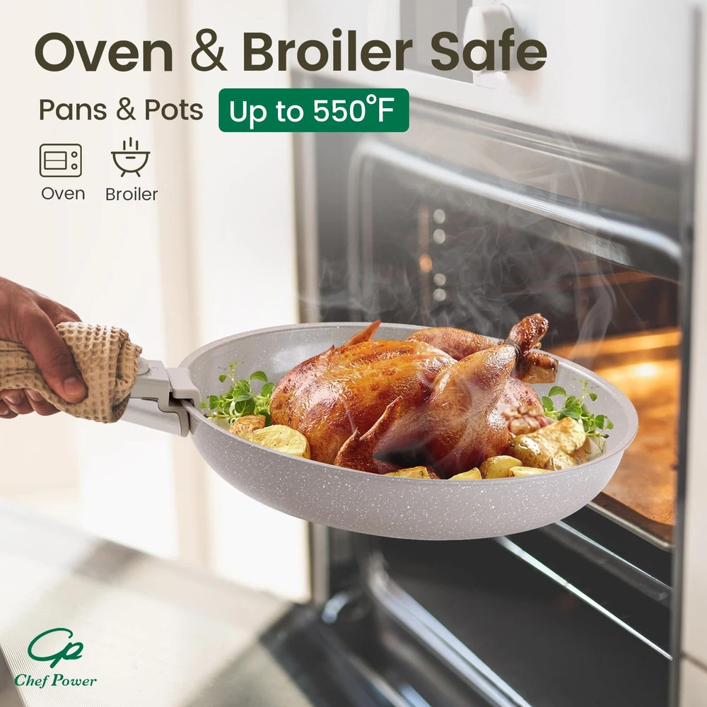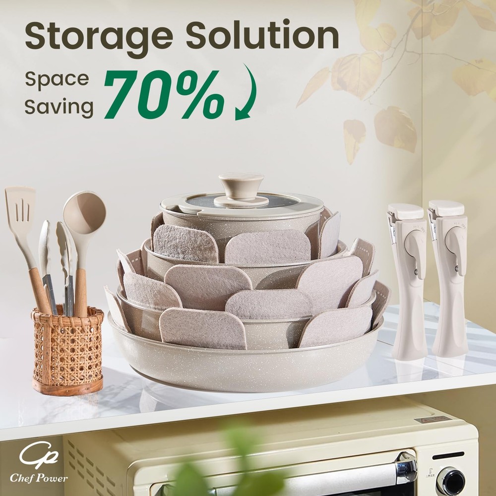 This set includes 1 deep sauté pan, 2 saucepans, 2 frying pans, 2 detachable handles, 3 silicone lids, 3 silicone utensils,4 pot protectors and 2 sealing lids for convenient storage. Optimal storage and easy stacking with the handles off saves up to 70% more space of detachable handle pots and pans Set. Our cookware set can be used in the oven up to 842 degrees. These ceramic nonstick pots and pans work on all types of stoves: electric, induction, fire, gas and ceramic stoves. After all the cooking is done, place cookware set in the dishwasher for quick and easy cleanup. Easy To Store - removable cookware set makes kitchen storage simple, easy to stack and saves 70% space. Easy To Clean - pans and pots set is designed with ceramic nonstick throughout, support dishwasher and handwash. All Stoves Available - Cookwares support induction, gas, electric, ceramic and oven safe up to 550°F. Silicone lids oven safe up to 350°F. Sealing lids up to 170°F down to -100°F. Multi-Functional Set - One set solves multiple needs, can be used as tableware and grill pan, and can be stored in the refrigerator with the lid on. 19 Pcs Cookware Set Includes- 1.5 QT SAUCEPAN, 3.2 QT SAUCEPAN, 3.4 QT STOCK POT, 9” FRYING PAN, 11” FRYING PAN, 6”-8”-10” SILICONE LIDS, DETACHABLE HANDLE* 2, SILICONE SLOTTED TURNER, SILICONE LADLE, SILICONE LOCKING TONG, POT PROTECTORS*4