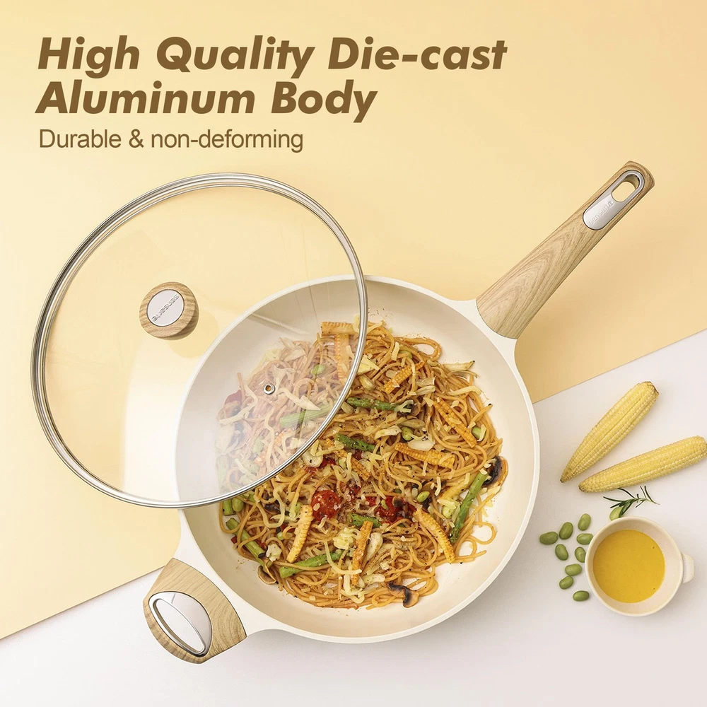 Ceramic Pots and Pans Set Non stick, Kitchen Cookware Sets, 14-Piece Induction Cookware, Non-toxic Healthy Non Stick Cooking Set, with Frying Pans Set, Saucepan, PFAS PTFE PFOA PFOS Free Healthy Ceramic Cookware - SGS approved. non-toxic, free of PTFE, PFAS, PFOA, PFOS, APEO, lead, cadmium and other toxic substances that can leach into food. Naturall Nonstick - Ceramic non-stick is healthier and scratch-resistant with excellent food release. Only less oil is needed for cooking, for a healthy, low-fat diet. 14 Piece Pots and Pans Set Includes - 8 & 9.5 inch frying pan set, 12inch/5Qt saute pan with lid, 6.5Qt casserole with lid, 2Qt saucepan with lid, 2pcs multi-purpose utensils, 4pcs pot protectors. Induction Compatible - 4.8mm thick stainless steel pan bottom makes this cookware set suitable for all stovetops. Die-cast aluminum construction allows the pan to heat up quickly and evenly, keeping the heat consistent. No warping and durable. Easy to Clean - Simply wipe with a paper towel or rinse with water, hand washing is recommended as it cleans effortlessly. Stay-Cool Handle & Glass Lid - The anti-scald wood-grain Bakelite handle is ergonomically designed for comfort and ease of handling. The explosion-proof glass lid prevents splashing and ensures maximum visibility. Healthy Ceramic Cookware Set - Ceramic non-stick surface, safe and non toxic, free of PFOA, PTFE, PFAS, PFOS, lead, cadmium and other toxic substances that can leach into food. Naturall Nonstick - Ceramic non-stick is healthier than Teflon coating! Scratch-resistant with excellent food release. Only less oil is needed for cooking, for a healthy, low-fat diet. 14 Piece Pots and Pans Set Includes - 8 & 9.5 inch frying pan set, 12inch/5Qt saute pan with lid, 6.5Qt casserole with lid, 2Qt saucepan with lid, 2pcs multi-purpose utensils, 4pcs pot protectors. Easy to Clean - Simply wipe with a paper towel or rinse with water, hand washing is recommended as it cleans effortlessly. Induction Compatible - 4.8mm thick stainless steel pan bottom makes this cookware set suitable for all stovetops. Die-cast aluminum construction allows the pan to heat up quickly and evenly, keeping the heat consistent. No warping and durable. Stay-Cool Handle & Glass Lid - The anti-scald wood-grain Bakelite handle is ergonomically designed for comfort and ease of handling. The explosion-proof glass lid prevents splashing and ensures maximum visibility.