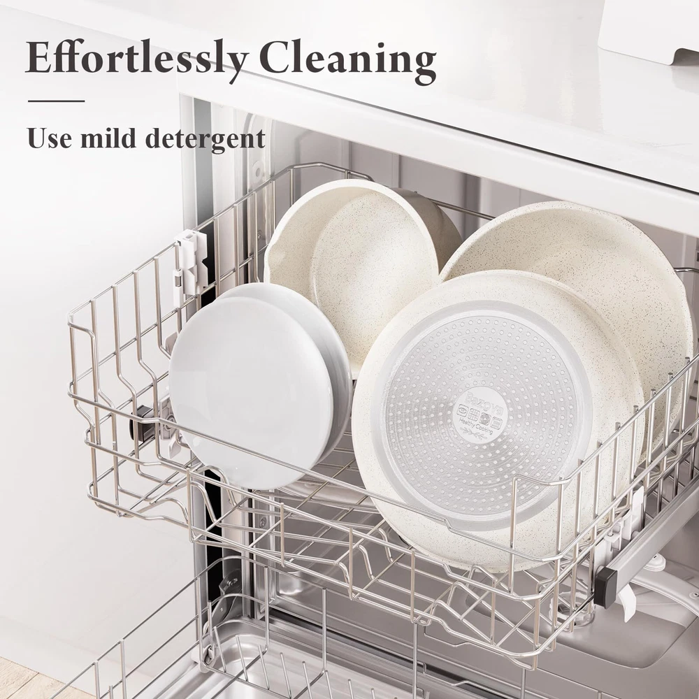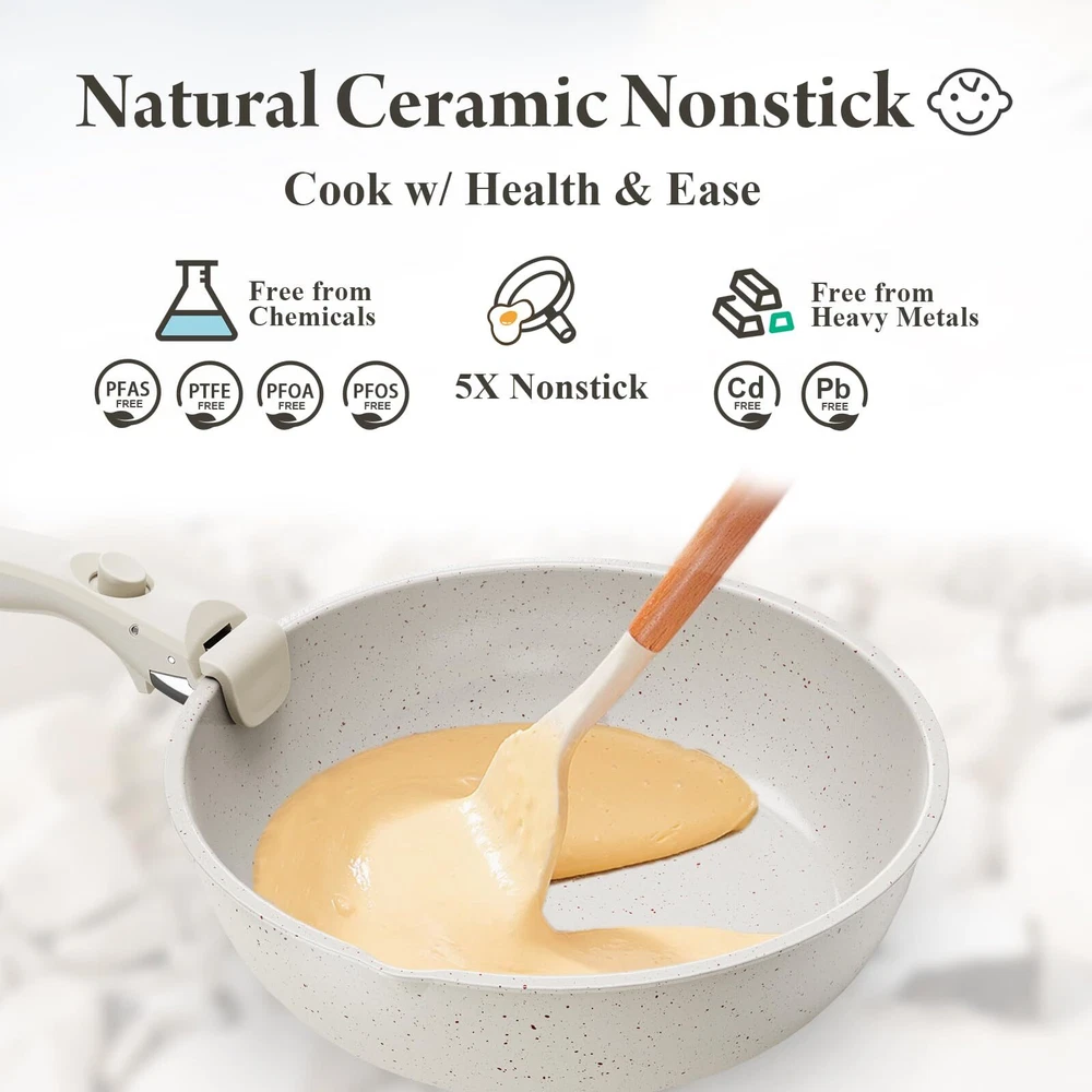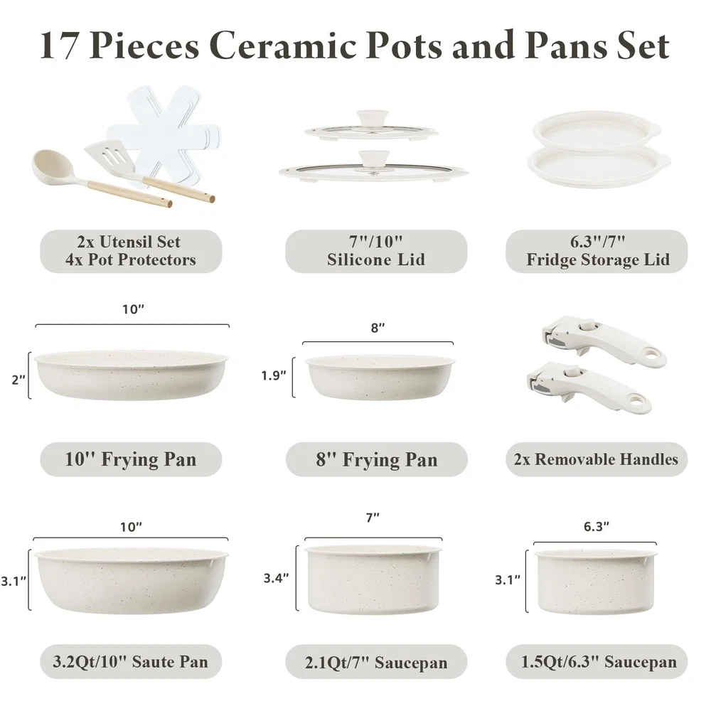 Healthy Ceramic Coating: Made of natural ceramic, our kitchen cookware set is Teflon-free and guarantees no PFAS, PTFE, PFOA, lead, or cadmium. Ideal choice for safety-conscious families, especially those with babies Effortless Storage: Save 70% kitchen space by neatly stacking pots and pans in cabinets or drawers; perfect for compact spaces, RVs and campers Innovative Detachable Handles: Transform pots with a "CLICK" into baking dishes, serving plates, or fridge storage, enhancing versatility. NOTE: The handle is made of bakelite and silicone, overheat will cause discolor or even burnt.Please detach it when you are not using it for fixing. Ultra Non-Stick Performance: Experience 5X superior non-stick cooking with minimal oil - food just slides off smoothly.No fumes emitted, even when overheated. NOTE: using oil spray will damage the coating. Just add a small amount of butter or oil will be enough.Low to medium heat is suggested for better non stick performance. Easy Cleaning: While our cookware is dishwasher-safe for your convenience, we highly recommend handwashing. A simple rinse or quick wipe effortlessly removes any residue, ensuring your cookware remains spotless and maintains its pristine condition with ease Universal Cooktop Compatibility: Enlarged, thickened magnetic base ensures compatibility with all stovetops, including induction and oven; Crafted from recyclable aluminum ensures lightweight yet sturdy, and promotes rapid and even heating 17-Piece Set Includes: 1.5QT(6.3") & 2.1QT(7") saucepans, 8-inch & 10-inch frying pans, 3.2QT(10")sauté pan, 2 removable handles, 7-inch & 10-inch glass lids, 6.3-inch & 7-inch fridge lids, 4 pot protectors, silicone slotted turner & ladle