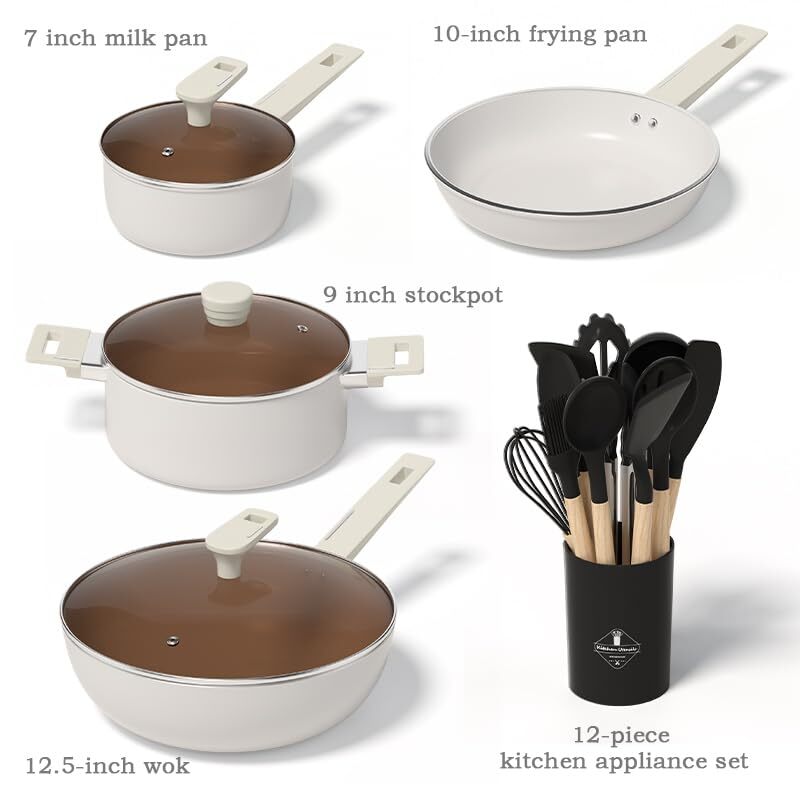Ceramic Pots and Pans Set Nonstick,kitchen Cook sets, White Handle Induction Kitchen Cookware Sets, 16 Pcs Non Stick Cooking Set w/Frying Pans &Soup Pot,PFAS PTFE PFOA PFOS Free Healthy Ceramic Cookware Sets - SGS approved. Non-toxic, free of PTFE, PFAS, PFOA, PFOS, APEO, lead, cadmium and other toxic substances that can leach into food. Naturall Nonstick - Ceramic non-stick is healthier and scratch-resistant with excellent food release. Only less oil is needed for cooking, for a healthy, low-fat diet. 16 Piece Pots and Pans Set Includes - 9 inch stockpot,7 inch milk pan,12inch/5Qt saute pan with lid, 10 inch frying pan and 12 piece kitchen appliance set. Induction Compatible - 4.8mm thick stainless steel pan bottom makes this cookware set suitable for all stovetops. Die-cast aluminum construction allows the pan to heat up quickly and evenly, keeping the heat consistent. No warping and durable. Easy to Clean - Simply wipe with a paper towel or rinse with water, hand washing is recommended as it cleans effortlessly. Stay-Cool Handle & Glass Lid - The anti-scald wood-grain Bakelite handle is ergonomically designed for comfort and ease of handling. The explosion-proof glass lid prevents splashing and ensures maximum visibility. 16 Piece Pots and Pans Set Includes - 9 inch stockpot,7 inch milk pan,12inch/5Qt saute pan with lid, 10 inch frying pan and 12 piece kitchen appliance set. SHIPPING Domestic Buyers - We have confidence in our products, but if you are not fully satisfied please contact us within 30 days of purchase and you will get full refund. - We ship within 3 business days of payment, usually sooner - We offer FREE shipping on all orders! - We only ship to the lower 48 states, no APO/FPO addresses or PO Boxes allowed International buyers – please note: Import duties, taxes, and charges aren't included in the item price or postage cost. These charges are the buyer's responsibility. - Please check with your country's customs office to determine what these additional costs will be prior to bidding or buying. * Order Cancellation Policy ** You can return a product for up to 30 days from the date you purchased it. 1. The seller reserves the right to cancel the special case only due to eBay cancellation fee. 2. The decision of seller is the final. 3. The seller will respond to the cancellation request within 2 business days. Please wait for the result of cancellation. 4. In case the cancellation is not completed by some reasons, the buyer can follow the options below to get the refund. 4.1 The buyer can reject the item when it arrives. 4.2 The buyer can send the item back to the seller within 30 days If the buyer receives item (USA Shipment ONLY). The seller will provide the FREE return label to the buyer when the buyer opens " Return Item" case on eBay by using the reason as "Change my mind" ONLY. 5. When buyer has placed the order. The order will be processed and completed by automatic warehouse system within 5 minutes. In case that buyer sends the cancellation request after 5 minutes of placing the order, the request will be rejected. **Sending direct message to cancel the order is not allowed for every case.* Return Policy For the return case - If buyer would like to return the items for refund or replacement, please CONTACT SELLER to receive the free return label from seller. The refund or replacement will be processed with the tracking number of return label which is provided by seller only. The other ways of return which are not approved by seller will not be processed for the refund or replacement.