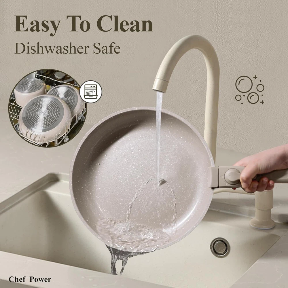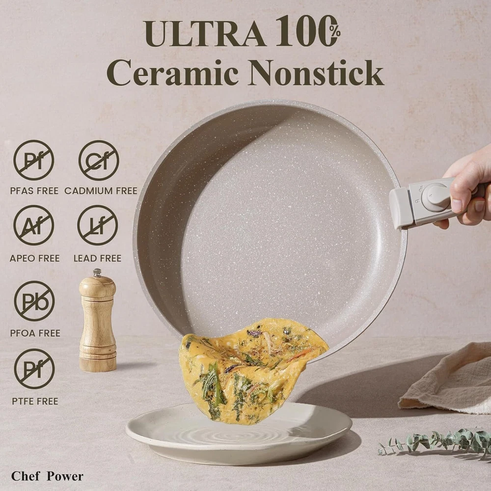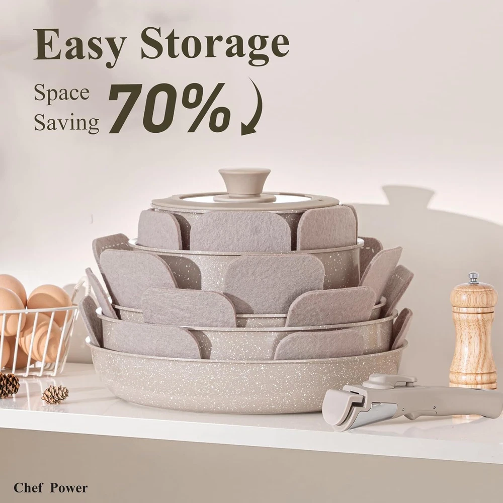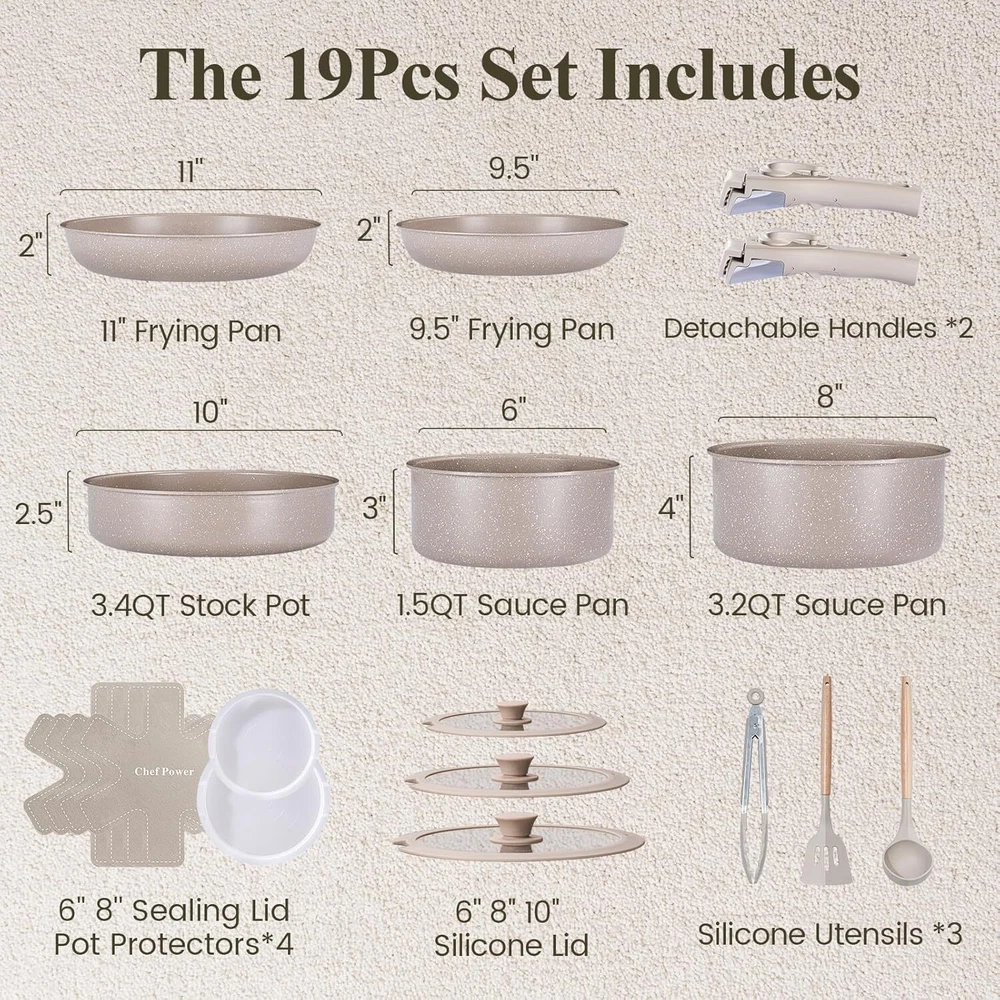 Easy To Store - Chef Power removable cookware set makes kitchen storage simple, easy to stack and saves 70% space. Easy To Clean - Chef Power pans and pots set is designed with ceramic nonstick throughout, support dishwasher and handwash. All Stoves Available - Cookwares support induction, gas, electric, ceramic and oven safe up to 550°F. Silicone lids oven safe up to 350°F. Sealing lids up to 170°F down to -100°F. Multi-Functional Set - One set solves multiple needs, can be used as tableware and grill pan, and can be stored in the refrigerator with the lid on. 19 Pcs Cookware Set Includes- 1.5 QT SAUCEPAN, 3.2 QT SAUCEPAN, 3.4 QT STOCK POT, 9” FRYING PAN, 11” FRYING PAN, 6”-8”-10” SILICONE LIDS, DETACHABLE HANDLE* 2, SILICONE SLOTTED TURNER, SILICONE LADLE, SILICONE LOCKING TONG, POT PROTECTORS*4