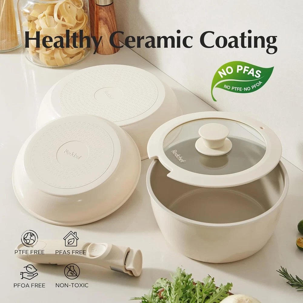 You may also like Non-Stick Cookware 8-Piece Set Pots and Pans Black Fry Pan Sauce Pan with Lid 67.19 USD 61.44 USD Free shipping 8% off Toxin-Free Nonstick Ceramic Cookware Set 12-Piece Durable Easy Cleanup Oven Safe 92.55 USD 97.42 USD Free shipping 5% off 15 Piece Kitchenware Pots & Pans Non-Stick Cookware Sets Cooking Pots with Lids 148.79 USD Free shipping Ceramic Pots and Pans Set Non Stick, Nonstick Kitchen Cookware Sets, Non Toxic Pots and Pans Set Non Stick, PFAS PFOA & PTFE Free, Detachable Handle Pots and Pans 5 Piece, RV Cookware Material Aluminum, Ceramic Color Beige White Size Beige White Handle Material Bakelite with silicone Natural Ceramic Coating: Made of natural ceramic, our Redchef kitchen ceramic cookware set is no Teflon and no PFAS, PTFE, PFOA, lead, or cadmium 75% Space-Saving: Save up to 75% more space with stackable pots and pans set and detachable handles; Neatly stack all the pots and pans, saving 75% of cabinet space—keeping the kitchen organized and tidy; Perfect for compact kitchens and an ideal choice for RVs or campers Ultimate Convenience: Removable handle for the ultimate versatility– go from ALL kinds of stoves to the oven, to the grill, to the fridge, and onto the table in one click; The handle's detachability brings a new cooking style Oven Safe: All Redchef's pots and pans cookware set is oven safe up to 842 degrees, making cleanup a breeze and giving you more options for cooking and baking; These Redchef ceramic nonstick pots and pans cookware sets are compatible with all stovetops including gas, electric, induction etc Longer Time Lasting: Redchef's pots ans pans sets itself apart with its unique patented technology, offering a stronger and more durable surface coating, resulting in a longer lifespan compared to most ceramic pots and pans set on the market; Whether it's wear resistance, high temperature resistance, or non-stick properties, it excels, satisfying users' demand for good quality ceramic pots and pans set Kitchen cookware set includes: a 2.5 quart saucepan, a 8-inch frying pan, an 10-inch large frying pan, a 8-inch visible silicone rimmed glass lid, and a detachable handle; This Redchef set has everything you need for your day-to-day cooking and is also suitable for RV or camping, making it an ideal cookware set for outdoor cooking Natural Dual-Sided Ceramic Coating: Redchef ceramic pots and pans set boasts an innovative dual-sided ceramic coating, inside and out; This advanced ceramic finish ensures effortless cleaning, allowing you to effortlessly wash both the interior and exterior of your pots and pans You may also like Gun Vise with Adjustable Cradle and Non-Marring Surfaces for Firearm Cleaning US 78.0 USD Free shipping Welder Extension Cord Heavy Duty 25 Feet 6-50 Nema R Plug Lighted Welding Cord 52.07 USD Free shipping Mobile TV Stand with Wheels Adjustable Rolling TV Cart for 32 to 75 inch LED TV 79.21 USD 83.38 USD Free shipping 5% off 24 Drawer Plastic Parts Storage Hardware and Craft Cabinet Bead Organizer Black 45.59 USD 41.64 USD Free shipping 8% off 4 Pack Linkable LED Utility Shop Light 4400 LM Super Bright 6500K Cool Daylight 59.99 USD 54.84 USD Free shipping 8% off Pond Cleaner And Sludge Remover With Natural Bacteria 64-Ounce Bottle,White 50.78 USD 46.67 USD Free shipping 8% off Mower 20" Replacement Blade for MNA152701 and MNA152516 24.15 USD Free shipping 25Ft 10Gauge Heavy Duty Outdoor Extension Cord Waterproof Lighted End Durable US 55.19 USD 50.44 USD Free shipping 8% off Extendable Handle Hoe Corona Extendable Hoe/Cultivator W/ Extra Reach 18in-32in 26.23 USD Free shipping 6 Inch Mini Chainsaw Cordless Portable Handheld Small Chain Saw for Wood Cutting 50.39 USD 46.04 USD Free shipping 8% off Large Specialty Moving Boxes TVs Pictures Mirrors Reusable Durable 4 Pack New 47.99 USD 43.84 USD Free shipping 8% off 10 Pack Linkable LED Utility Shop Light 4400 LM 6500K Cool Daylight 250W Garage 107.99 USD 98.84 USD Free shipping 8% off