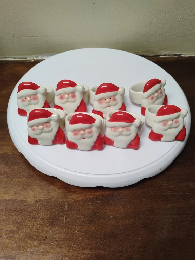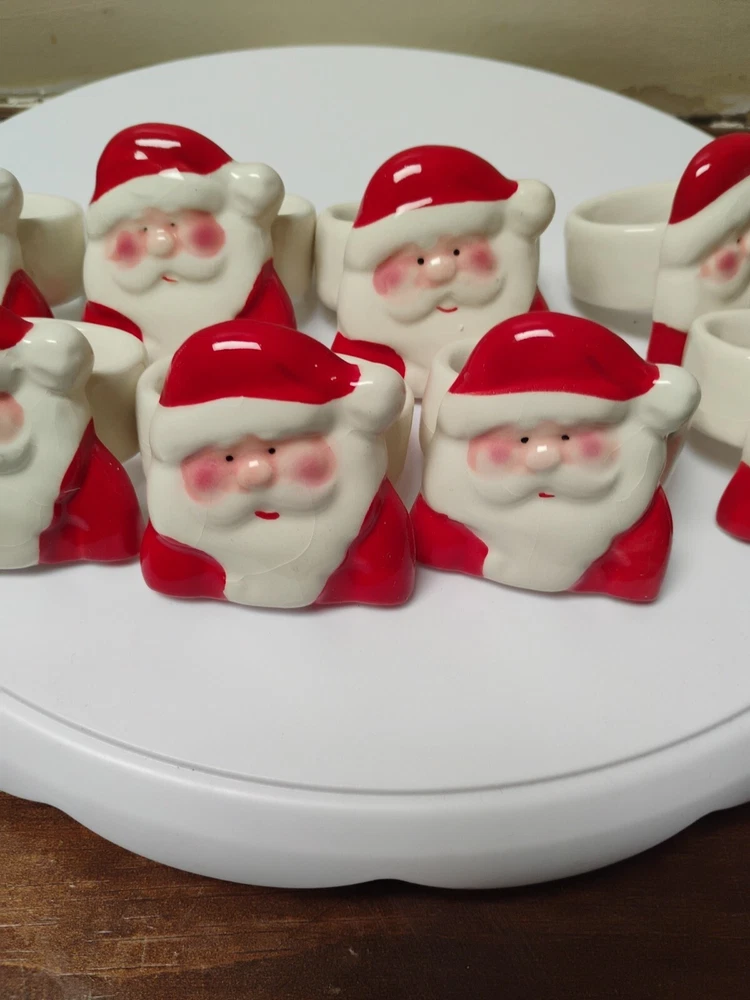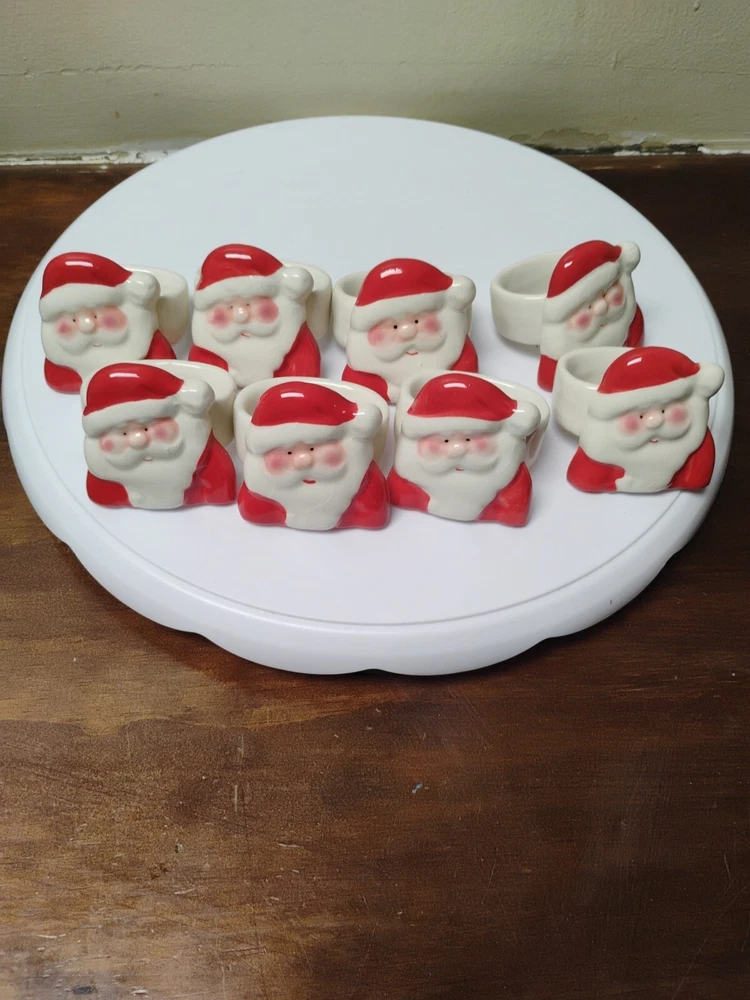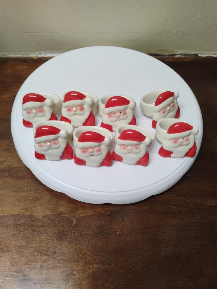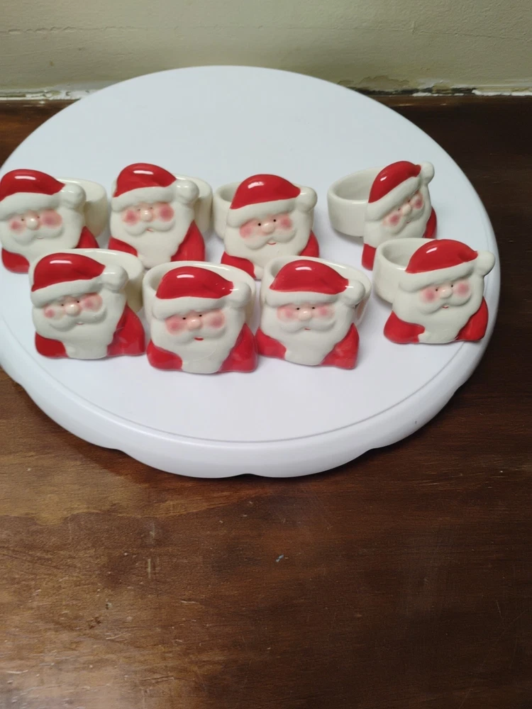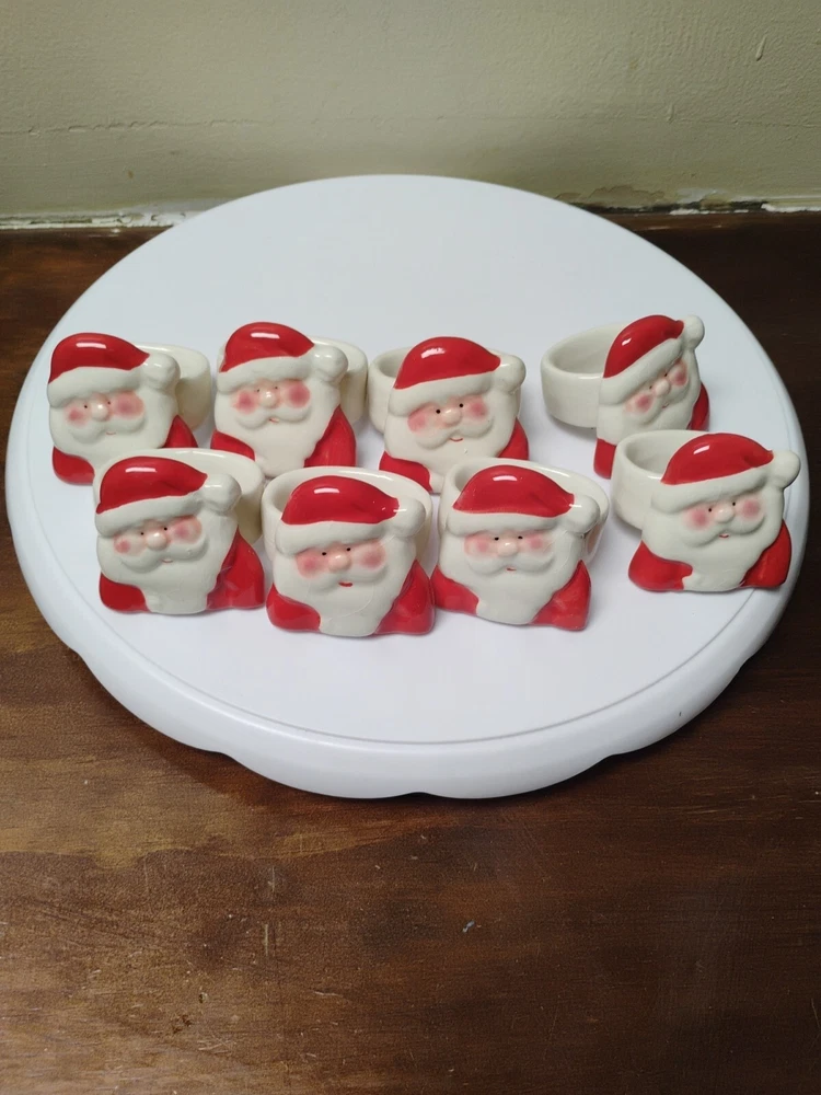 The product is a set of 8 ceramic Santa Claus napkin ring holders designed for a holiday Christmas table setting. Each napkin ring features a Santa Claus character in a multicolor design.