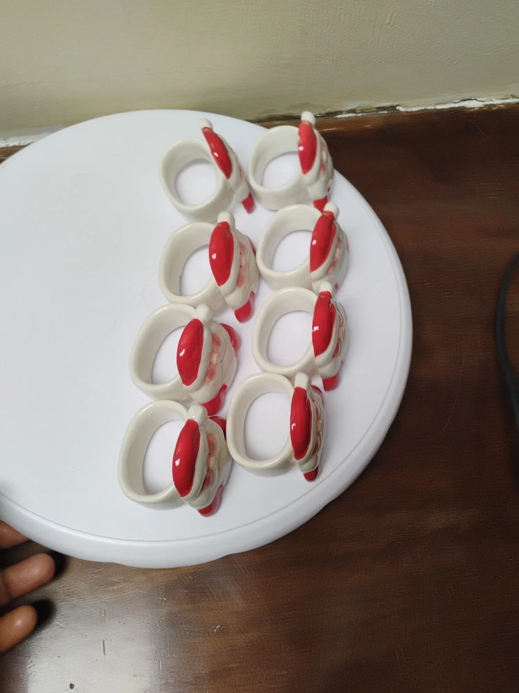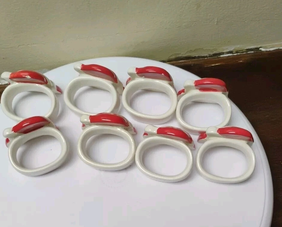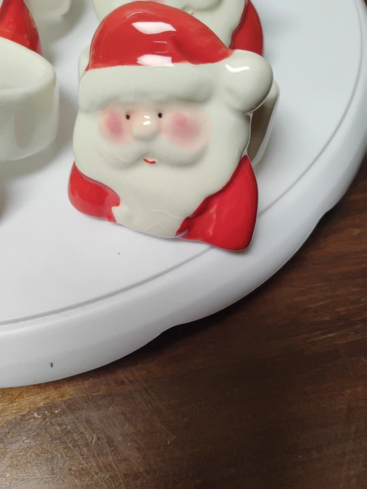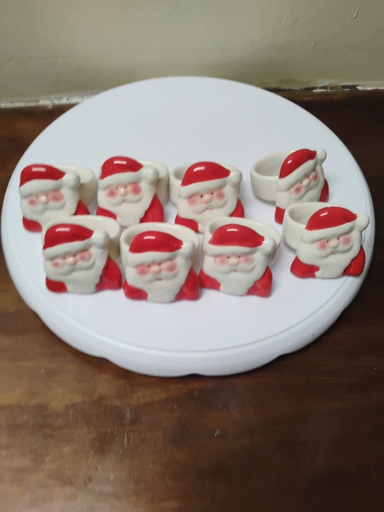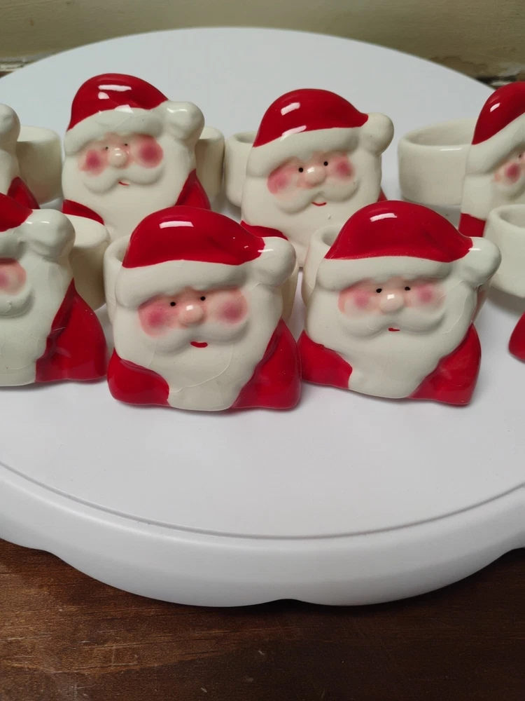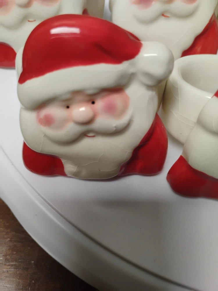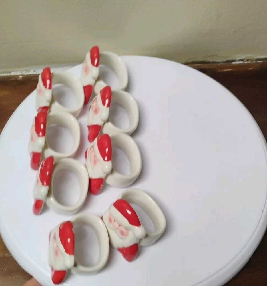 The product is a set of 8 ceramic Santa Claus napkin ring holders designed for a holiday Christmas table setting. Each napkin ring features a Santa Claus character in a multicolor design.
