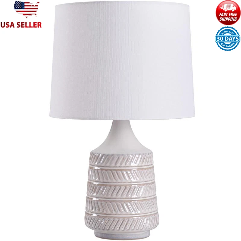 Add light and style to your room with the Better Homes a& Gardens White Ceramic Base Table Lamp with Shade. This modern lamp creates a unique texture look and is perfect for living rooms, family rooms, dens, bedrooms, guest rooms, offices, dorm rooms, and more. The unit measures 17 inches high and will sit easily on any desk, nightstand or end table. This Better Homes & Gardens White Ceramic table lamp is compatible with CFL 13W, LED and incandescent bulbs(not included), so you have total flexibility to light your space as you prefer. 17" Overall Height Product size: 10. 5" W x 10. 5" L x 17" H Shade size: 9.5" x 10.5" x 8" H