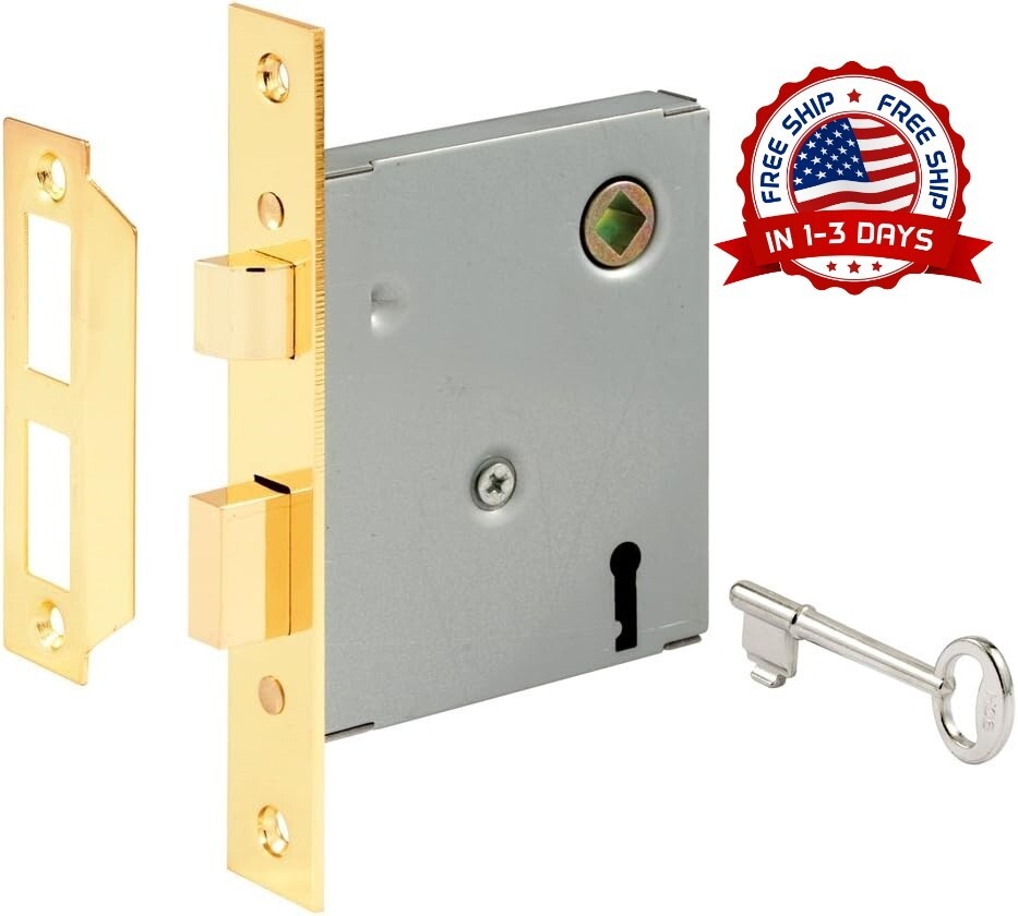 Cerradura de embutir de estilo vintage para interiores, eje cuadrado de 1/4" máx REEMPLAZO DE CERRADURAS DE EMBUTIR ANTIGUAS: El kit de montaje de cerradura de embutir es una excelente alternativa a las cerraduras antiguas de las casas de época. Compatible con herrajes antiguos y vintage, el kit es un reemplazo económico para cerraduras de embutir de interior. FÁCIL INSTALACIÓN: La instalación es rápida y sencilla, e incluye todos los tornillos de montaje. La cerradura de embutir se desliza fácilmente en el hueco de la puerta para reparar una cerradura rota. Tiene una entrada de 2-3/8" con un cuadradillo de 9/32" que admite un cuadradillo de 1/4" como máximo. ACERO CON ACABADO LATONADO: La cerradura está fabricada en acero cementado y cuenta con una placa frontal con un acabado latonado brillante. El kit incluye un pestillo y una cerradura de cerrojo con sujetadores (las perillas, el cuadradillo, las llaves de repuesto y las placas de moldura se venden por separado) y dos llaves de esqueleto. PUERTAS INTERIORES IZQUIERDAS O DIESTRAS: La cerradura de embutir se entrega con la mano izquierda (para cerrar en una dirección específica), pero el pestillo se puede invertir fácilmente para puertas batientes opuestas. CONSEJO DE INSTALACIÓN: Aunque el cuadradillo del pestillo tiene una abertura de 9/32", solo admite cuadradillos de 1/4".