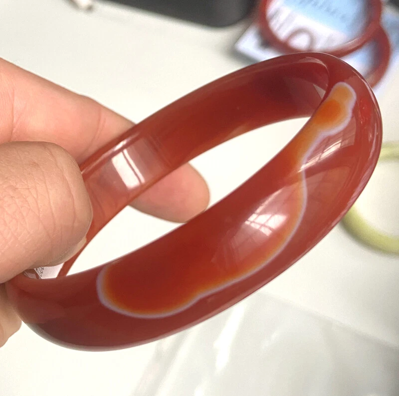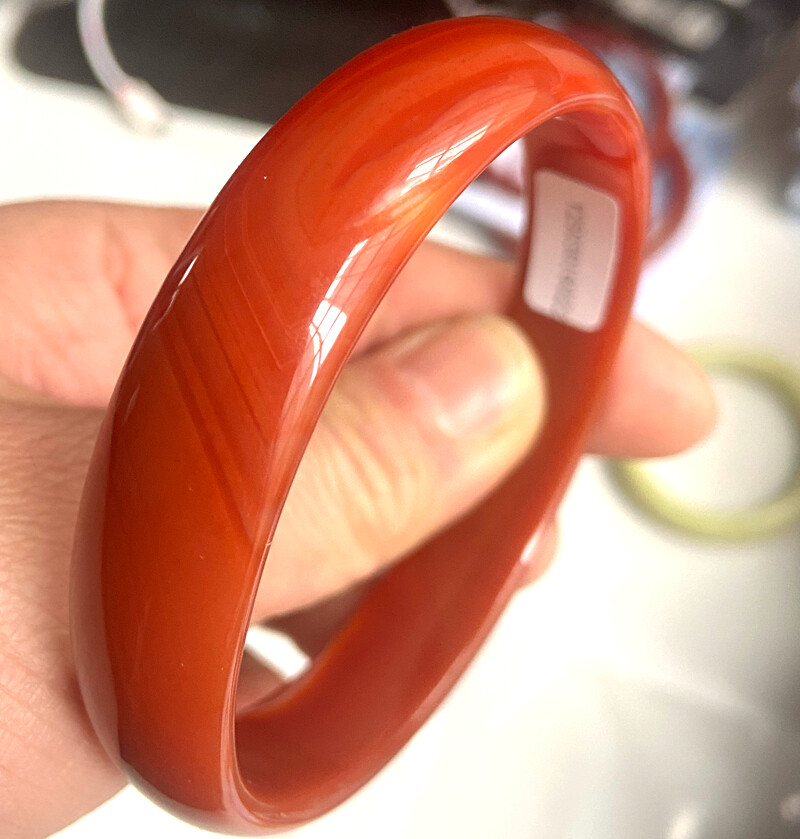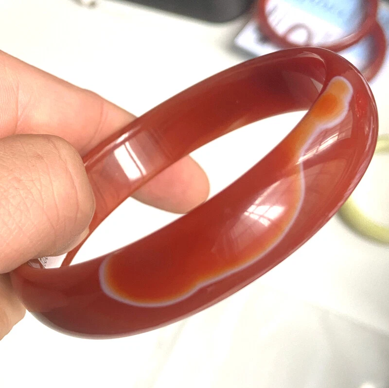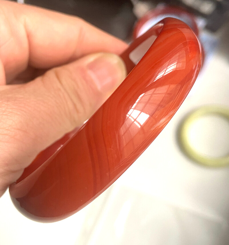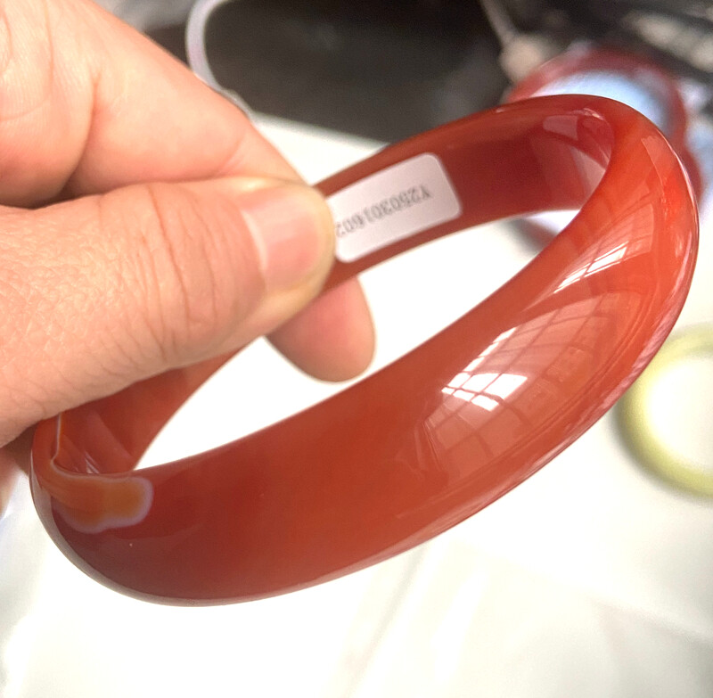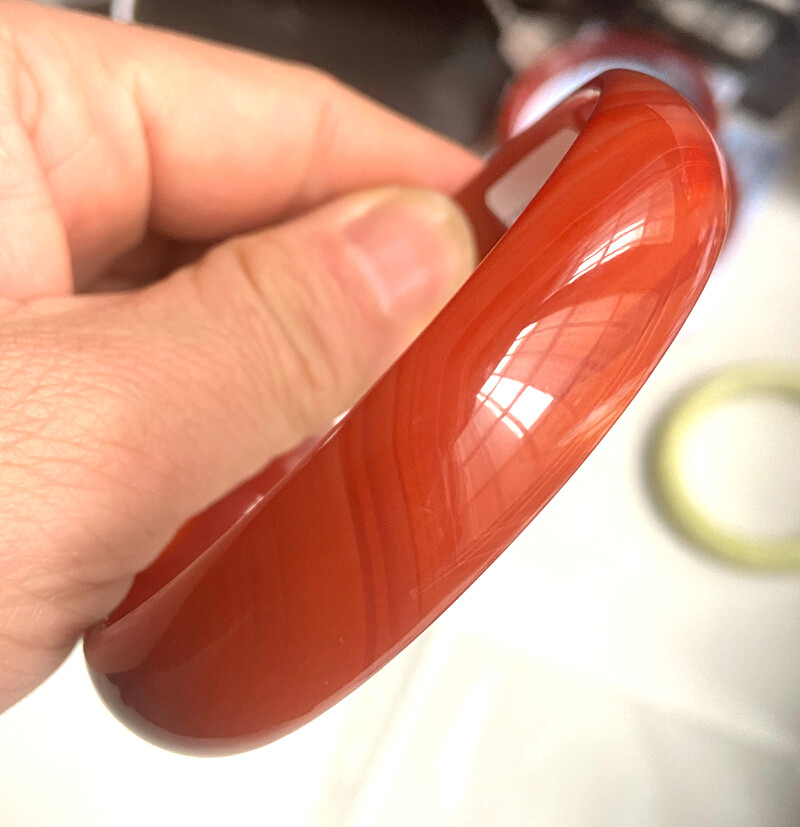Just got this stunning brazilian chalcedony bangle and wow! The icy red color is absolutely mesmerizing - it catches the light beautifully. Fits perfectly and feels so smooth and cool against the skin. Arrived in perfect condition and looks way more expensive than it was. Definitely my new favorite piece!