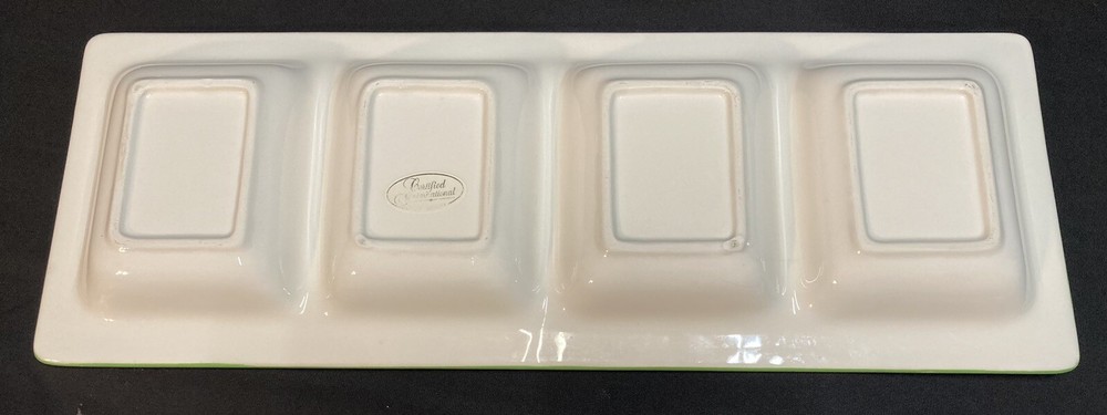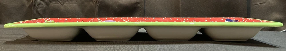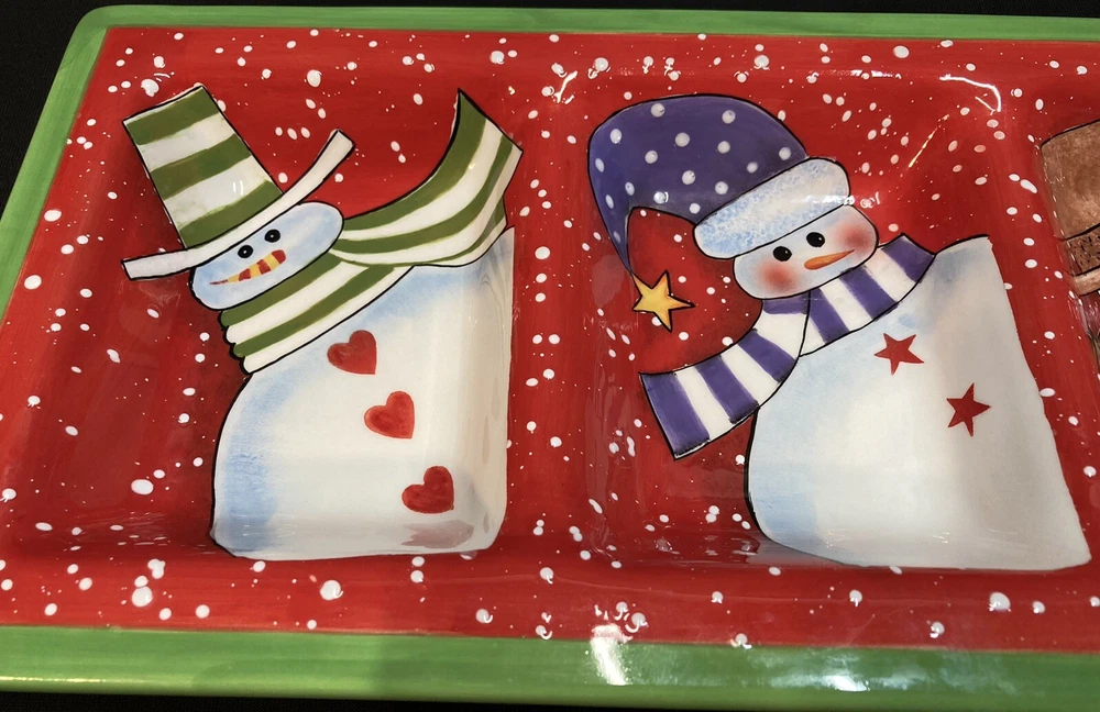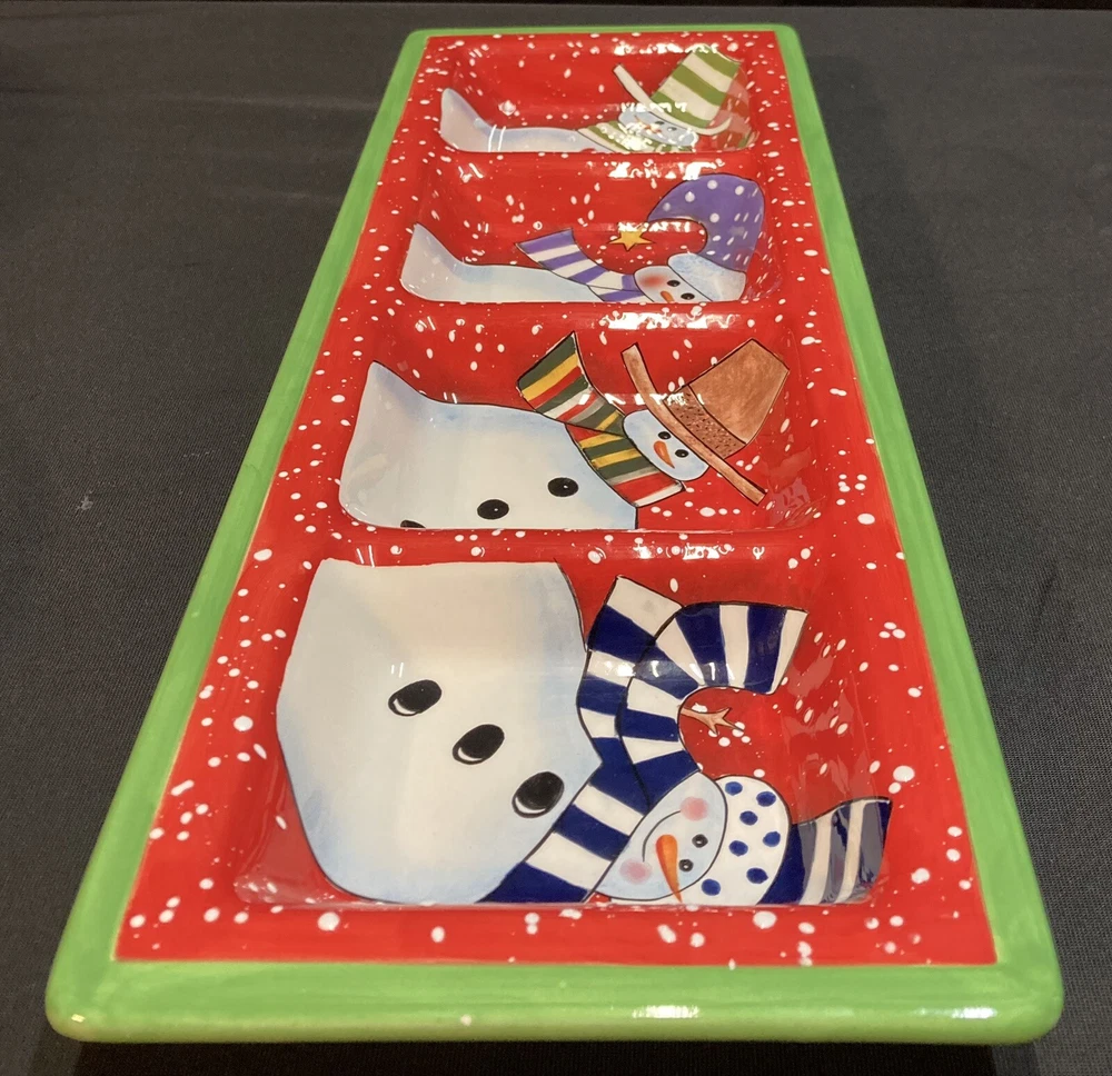This festive 4-section snowman candy/serving dish by Certified International measures 18.75 inches in length, 7 inches in width, and 1.5 inches in height. The item is pre-owned and comes in good, clean condition with no chips, cracks, or breaks. Please see pictures for complete details. If you have any questions or concerns, please do not hesitate to contact us. Check out our other items and message us if interested in more than one listing as combining items could save you money on shipping. RETURNS & REFUNDS Please inspect your item as soon as it arrives. We stand by the quality of the items we sell and will issue a full refund, including shipping charges, on any defective item that is returned. Please note: photos of the item, packaging, serial numbers and/or product identifiers may be required in order to guarantee a full refund. Returns are accepted on non-defective items; however, shipping charges will be withheld from your refund.