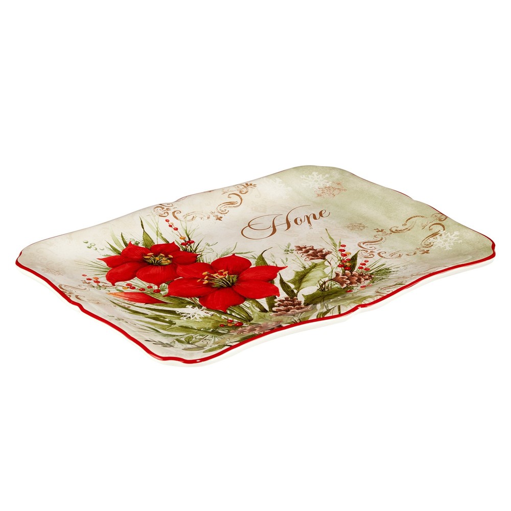 Beautiful red cardinals and poinsettias decorate Certified International's" Winter's Medley "Rectangular Platter designed by the popular artist Susan Winget. Accented with an inspirational sentiment, this generously sized, uniquely shaped ceramic 14.25 in X 10.25 in Platter is perfect for serving your favorite holiday family style meals. Coordinating dinnerware completes this lovely and colorful holiday collection for your home.Features:Includes: Winter's Medley Rectangular Platter, 14.25 inches X 10.25 inches Made From Durable EarthenwarePerfect for holiday dining and entertainingGreat for holiday giftsGet the coordinating serveware and 3-d accessoriesDishwasher SafeDimensions:Items Dimensions: 14.25 inches x 10.25 inches x 1.25 inchesThis product will ship to you in one (1) box. Free Shipping Over $49.99* Details Certified International Winter's Medley Rectangular Platter, 14.25" X 10.25" Product Description: Beautiful red cardinals and poinsettias decorate Certified International's" Winter's Medley "Rectangular Platter designed by the popular artist Susan Winget. Accented with an inspirational sentiment, this generously sized, uniquely shaped ceramic 14.25 in X 10.25 in Platter is perfect for serving your favorite holiday family style meals. Coordinating dinnerware completes this lovely and colorful holiday collection for your home. Features: IncludesWinter's Medley Rectangular Platter, 14.25 inches X 10.25 inches Made From Durable Earthenware Perfect for holiday dining and entertaining Great for holiday gifts Get the coordinating serveware and 3-d accessories Dishwasher Safe Dimensions: Items Dimensions 14.25 inches x 10.25 inches x 1.25 inches This product will ship to you in one (1) box.