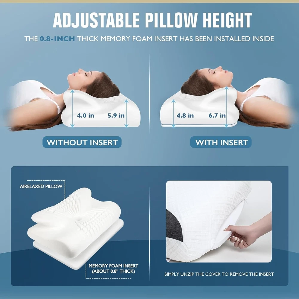 🛏️【【DREAM DEEPER WITH THE PERFECT PILLOW】Are you tired of waking up with neck pain? Why not try the Airelaxed cervical neck pillow, specially designed to provide optimal support and comfort? Featuring an improved hollow center, added neck massage points, and an ergonomic design, this pillow perfectly conforms to the natural curve of your neck and shoulders. It provides superior head support and allows your cervical spine to be effectively supported, stretched, and relaxed, significantly alleviating neck pain. Imagine experiencing a wonderful deep sleep and waking up refreshed and ready for a vibrant day. 🛏️【3D MASSAGE PARTICLES】Ever wondered how to achieve the perfect night's sleep? Our ergonomic pillow‘s unique 3D massage points are designed to enhance breathability and prevent nerve compression in your neck during long hours of rest. Why settle for ordinary pillows when you can relieve neck pressure and promote normal blood circulation for a deeper, more rejuvenating sleep? Experience unparalleled comfort and wake up feeling refreshed every morning with our cutting-edge design. 🛏️【NON-TOXIC & ODORLESS MEMORY FOAM】This premium 100% memory foam ensures that the pillow maintains its shape and performance over an extended period, remaining solid without being too soft, resistant to deformation. It provides customized support tailored to your head and neck contours, enjoy consistent comfort and relief for your head, neck, shoulders, and back, night after night. 🛏️【HEIGHTS ADJUSTABLE WITH REMOVABLE INSERT】Are you constantly searching for the perfect pillow height? Our contour neck pillow come with two different heights on each side, providing options to suit your preferences, catering to various sleeping postures such as stomach, back, and side sleeping. Plus, with a 0.8" thick removable insert, you can adjust the height according to your comfort needs. Whether you prefer a higher or lower profile, our neck and cervical pillow ensures optimal body support while allowing your head, neck, shoulders, and back muscles to achieve maximum relaxation. 🛏️【REMOVABLE & SKIN-FRIENDLY PILLOWCASE】The pillowcase is made of 100% polyester, ensuring skin-friendly comfort without concerns about allergies. The pillowcase perfectly conforms to the shape of the pillow, and a linking button is added between the pillow and the pillowcase to ensure it stays in place. The pillowcase is highly breathable and removable for easy cleaning, make sure a hygienic and fresh sleeping surface at all times. 【HASSLE-FREE PURCHASE EXPERIENCE!】If you have any questions about our neck pillows, feel free to contact our customer service. How much of a difference can a great neck support pillow make? The right memory foam neck pillow can relieve neck pain, improve overall sleep quality and help you start your brand new day more easily. It's a perfect birthday and Christmas present for parents, girlfriends, boyfriends, husbands, wives, and colleagues. Being pain-free is truly priceless! On Nov 14, 2024 at 01:51:09 PST, seller added the following information: