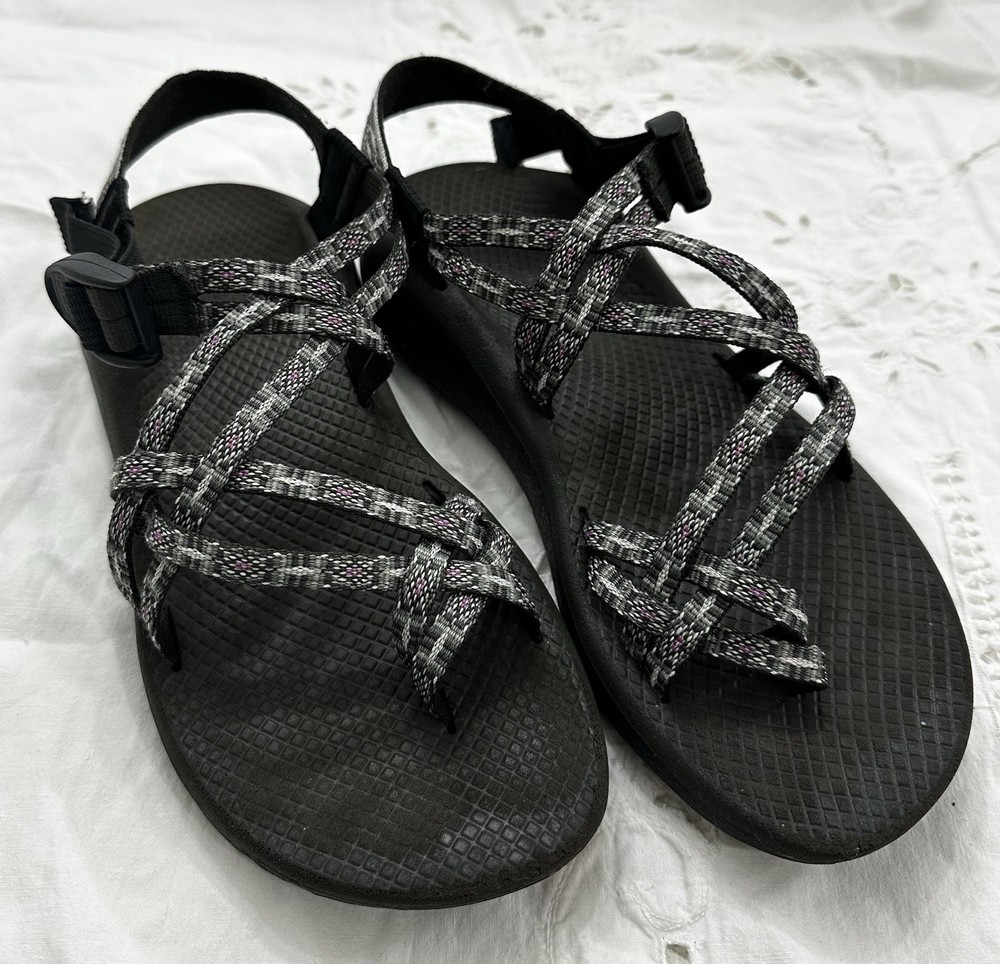 The Chaco Classic Women's Sandals in Grey/Purple, Size 9, are a stylish and comfortable option for women on the go. With a geometric pattern, adjustable buckle closure, and fabric lining, these sandals are perfect for travel, activewear, casual outings, and workwear. The flat heel and strappy style offer arch support and breathability, making them ideal for all-season wear. Made with a durable cotton blend upper and rubber insole, these Chaco sandals feature the brand's signature logo accents and are designed for comfort and practicality. Please see pictures for condition and any imperfections.