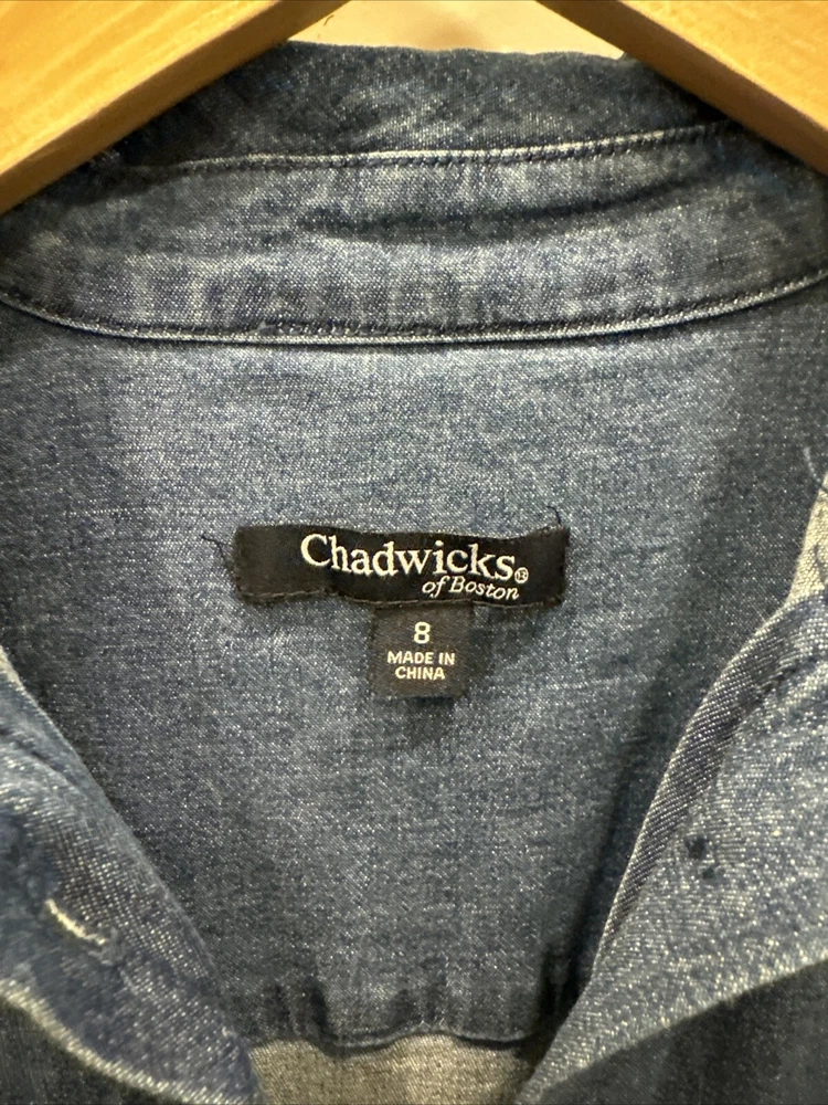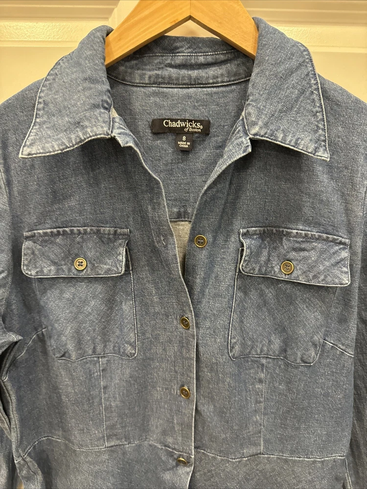 This Chadwicks of Boston blue denim dress is a timeless piece that will fit seamlessly into your wardrobe. The dress features a collared neckline, long sleeves, and a button front closure, making it suitable for a variety of occasions including travel, casual outings, and workwear. The dress is made of high-quality cotton material and has a solid pattern, making it a versatile addition to your wardrobe. The dress is a size 8 and has a long 54” length, perfect for any season including summer, fall, and spring. The dress has a Western, peasant, or 90s theme, adding a touch of uniqueness to your outfit. The skirt is cut on the bias. This shirt dress is a must-have for any fashion-forward woman and is sure to make a statement wherever you go.