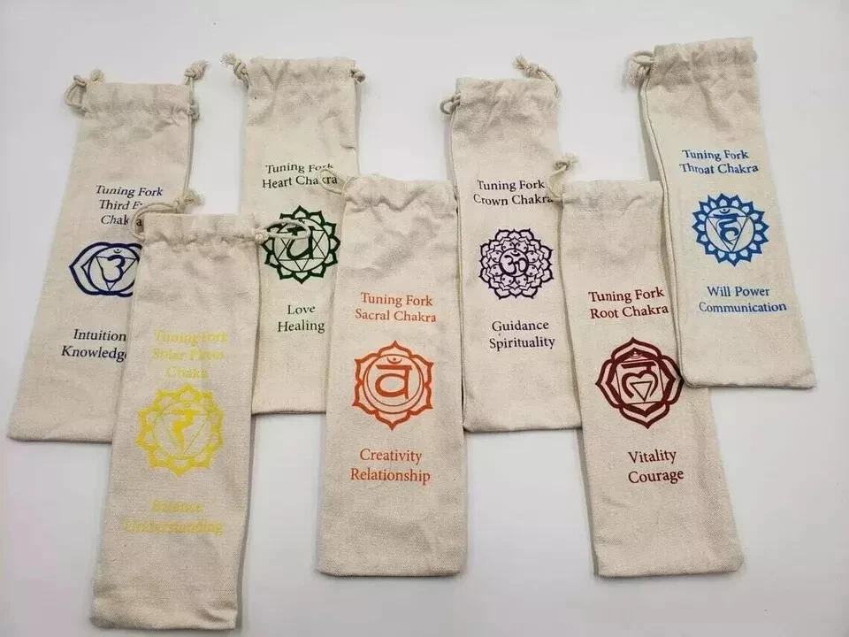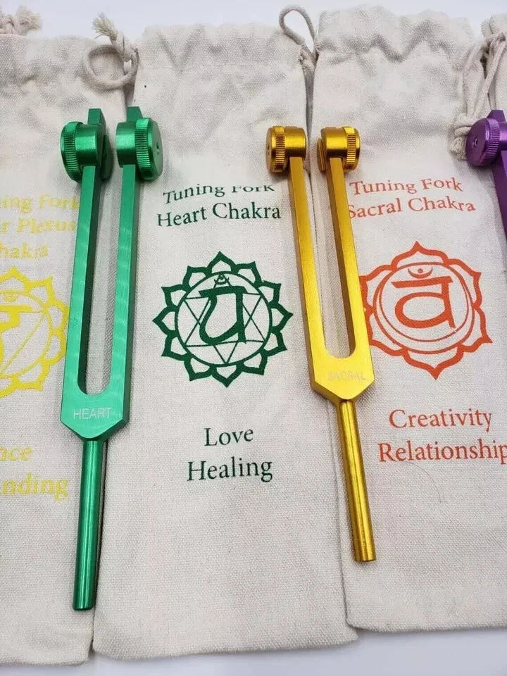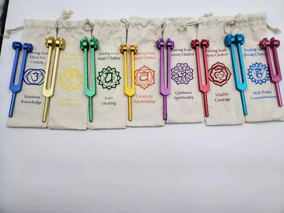 Description Welcome to a world of harmonic balance and energetic alignment. Introducing our Chakra Color Weighted Tuning Forks, a transformative set of tools for sound healing and chakra balancing. Each fork in this collection is carefully calibrated to resonate with the specific frequencies associated with the 9 chakras, allowing you to harness the power of sound to harmonize your mind, body, and spirit. The set includes 8 Chakra Weighted COLOR tuning forks Comes with a Mallet and individually marked Chakra signed Pouch for easy identification Let's explore the significance of each chakra and the transformative potential they hold: Root Chakra (Muladhara) - Located at the base of the spine, this chakra represents stability, grounding, and connection to the Earth. It governs our sense of security and survival instincts. Sacral Chakra (Svadhisthana) - Situated in the lower abdomen, this chakra is associated with creativity, passion, and emotional well-being. It guides our ability to experience pleasure and navigate our desires. Solar Plexus Chakra (Manipura) - Found in the upper abdomen, this chakra is associated with personal power, confidence, and willpower. It influences our self-esteem and ability to assert ourselves. Heart Chakra (Anahata) - Located in the center of the chest, this chakra governs love, compassion, and emotional healing. It guides our ability to give and receive love and fosters harmonious relationships. Throat Chakra (Vishuddha) - Situated at the throat, this chakra represents self-expression, communication, and authenticity. It empowers us to speak our truth and express ourselves creatively. Third Eye Chakra (Ajna) - Found between the eyebrows, this chakra is associated with intuition, clarity, and spiritual awareness. It enhances our inner vision and deepens our connection to our higher self. Crown Chakra (Sahasrara) - Located at the top of the head, this chakra symbolizes spiritual connection, enlightenment, and universal consciousness. It opens us to divine wisdom and spiritual transcendence. Soul Star Chakra (Transpersonal Chakra) - Positioned above the crown, this chakra connects us to higher realms, spiritual guides, and cosmic energies. It facilitates spiritual growth and enlightenment. Earth Star Chakra (Subpersonal Chakra) - Situated below the feet, this chakra anchors us to the Earth, providing a foundation for our physical and spiritual existence. It promotes stability and a sense of belonging. With our Chakra Color Weighted Tuning Forks, you'll receive not only a set of powerful instruments but also individually marked Chakra Bags and a mallet for each fork. Each bag is color-coded to correspond with a specific chakra, allowing you to easily identify and store your tuning forks in an organized and meaningful way. The mallet provided for each fork ensures that you can produce resonant and harmonious tones effortlessly. Crafted with precision and care, our tuning forks are weighted to deliver consistent and pure frequencies, promoting optimal healing and chakra alignment. The forks are made from high-quality materials to ensure durability and longevity, allowing you to incorporate sound healing practices into your daily routine for years to come. Whether you're a sound healing practitioner, energy worker, or simply someone on a path of self-discovery, our Chakra Color Weighted Tuning Forks provide a profound opportunity to harmonize your chakras, restore balance, and awaken your highest potential. Embrace the power of sound, color, and intention as you embark on a transformative journey of healing and self-realization. Note: The Chakra Color Weighted Tuning Forks set includes 9 forks, individually marked Chakra Bags, and a mallet for each fork. Used for: Chakra tuning forks Solfeggio tuning forks Energy healing tools Sound therapy instruments Chakra balancing set Vibrational healing Meditation accessories Spiritual healing tools Harmonic frequency forks Energetic alignment Chakra sound therapy Solfeggio frequency set Chakra tuning instruments Energy center alignment Healing sound vibrations Mind-body balance tools Vibrational medicine Chakra meditation aids Harmonizing energy tools Solfeggio sound healing