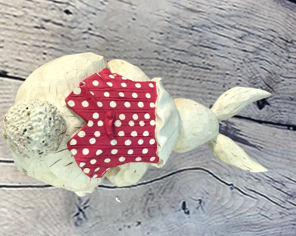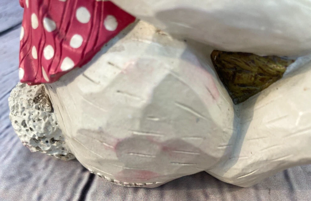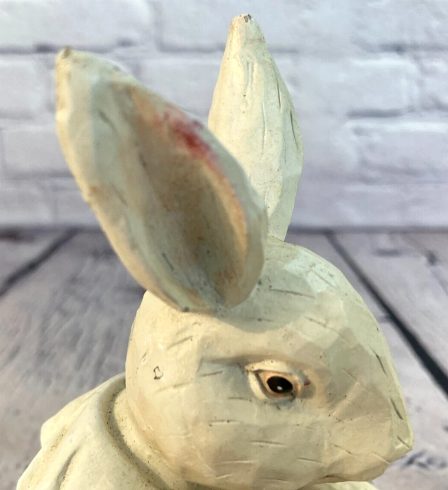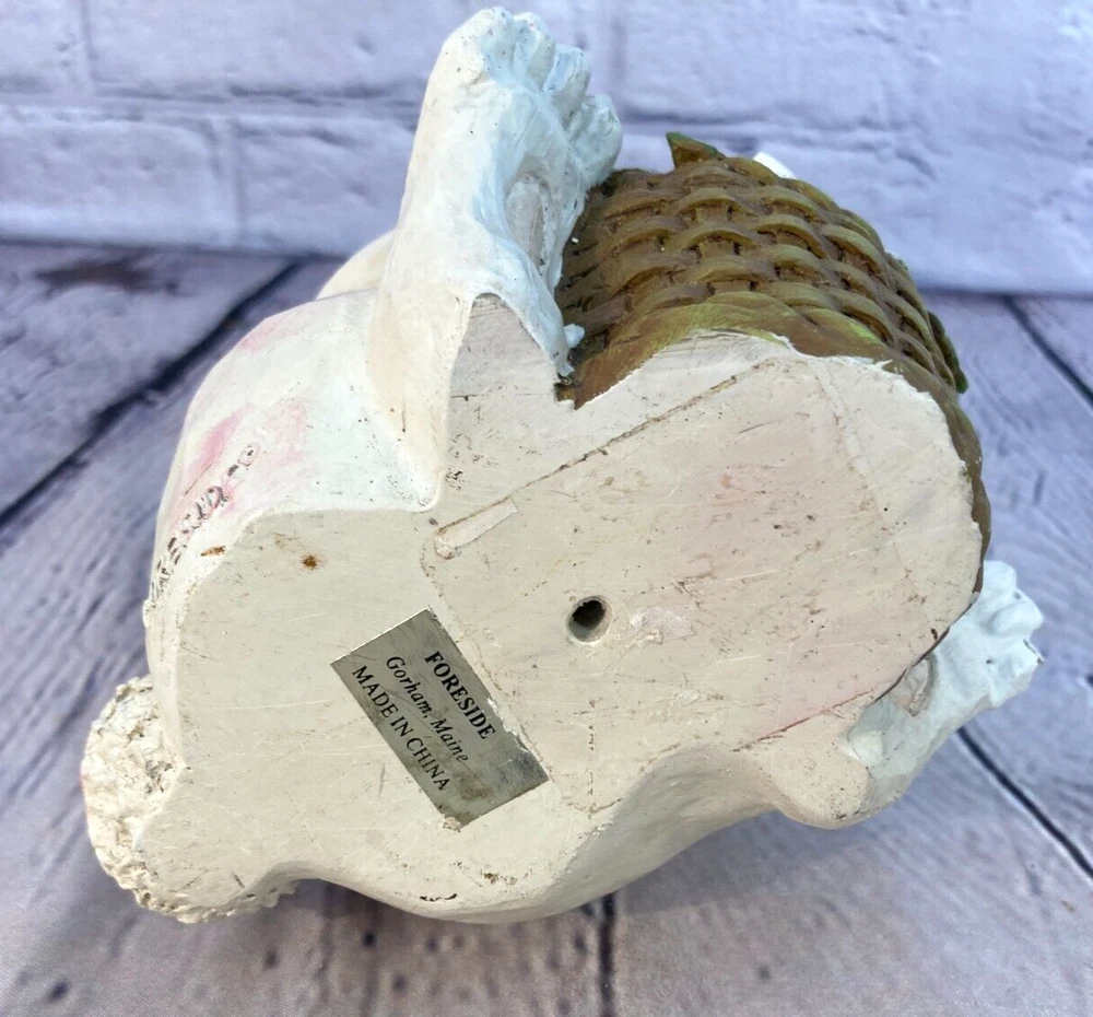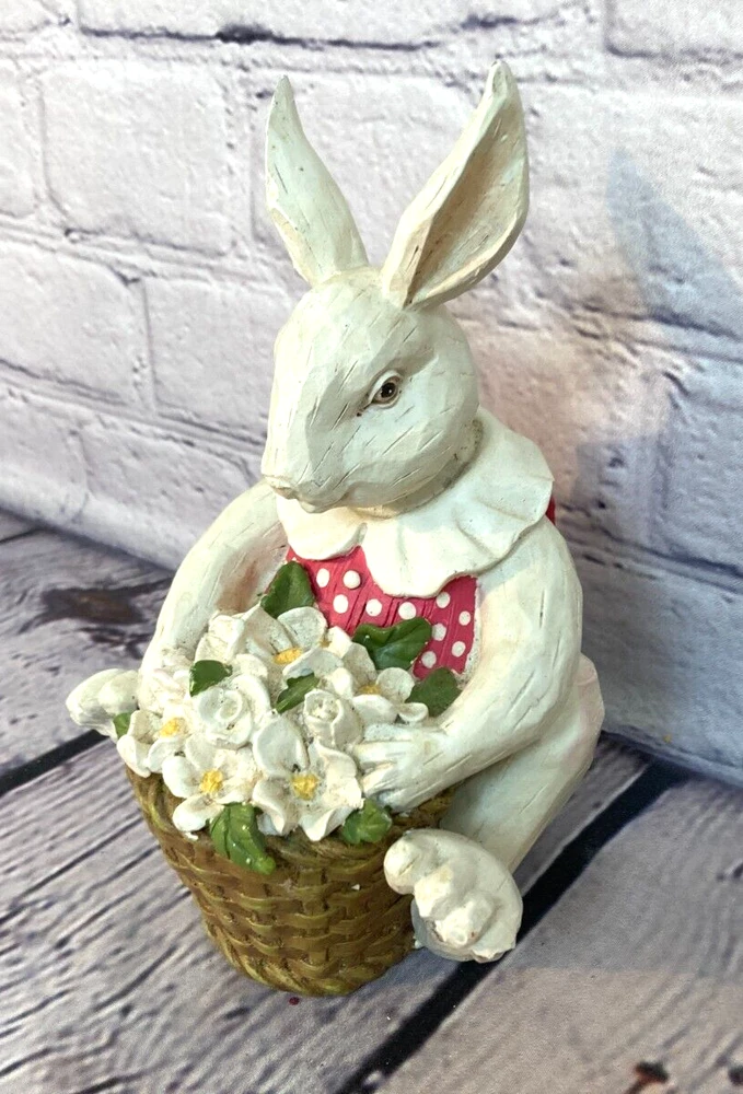 Resin White Easter Bunny Sitting Flowers Pink Vest Figure 7" Granny Cottage HEAVY. Bunny figure is holding a basket of flowers. Labelled as produced by Foreside in Maine. In good overall shape, has some areas where pink of the vest has lightly transferred to the white (see pictures). A nice heavy figurine.