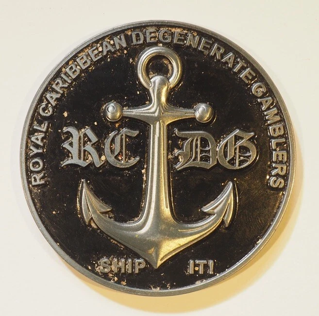 The challenge coin is an original item from the Royal Caribbean Degenerate Gamblers (RCDG) group in the United States. As a collectible piece, this token embodies the camaraderie and solidarity within the group through a shared symbol. The coin likely holds sentimental value to members of the RCDG, serving as a tangible reminder of their experiences and connections. Its authenticity as an original piece further enhances its value and appeal to collectors of challenge coins. Bar.60.765