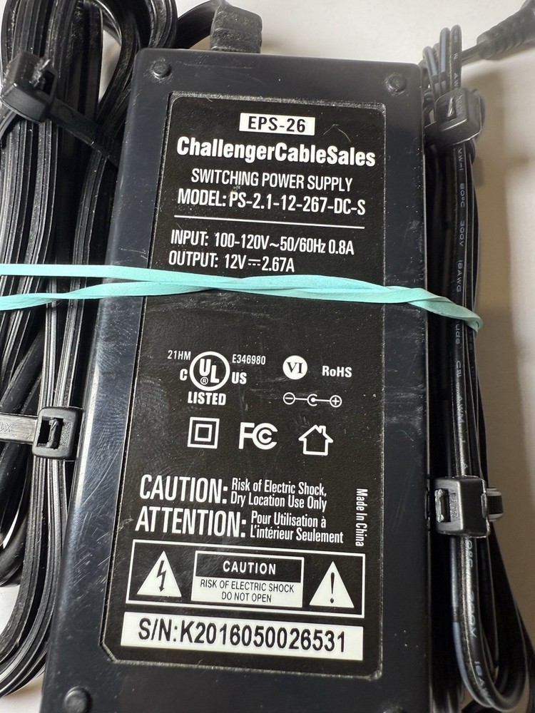 The Challenger Cable Sales Switching Power Supply Model PS-2.1-12-267DT1 is a black power supply with a 1:2 connection split/duplication. It has a PS/2 connector A and outputs 12V of voltage. This model is designed to power multiple devices and offers a reliable solution for providing electricity to various electronic components. The compact and versatile design of this power supply makes it suitable for a wide range of consumer electronics and devices.