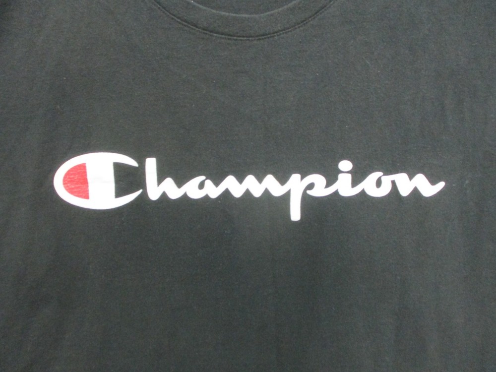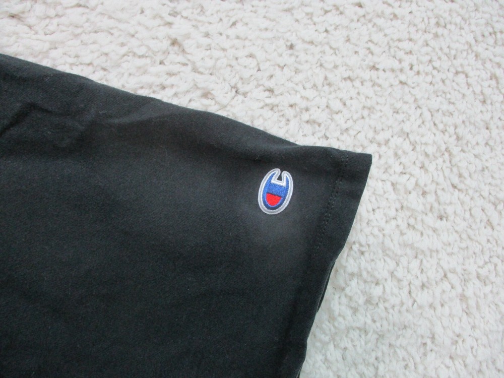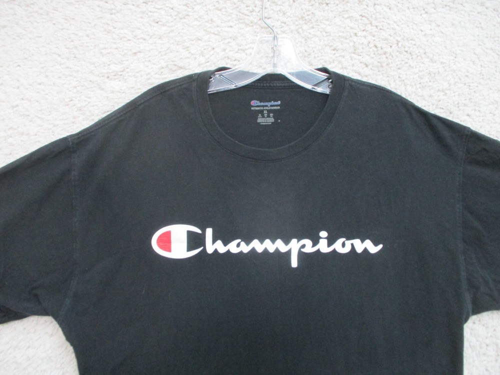 Accents: Logo Size: XL Pattern: Solid Department: Men Fabric Type: Knit Theme: Modern Country/Region of Manufacture: China Seller Notes: “Very Good Used Condition. Please, See Pictures for Full Condition and Measurements.” Brand: Champion Features: All Seasons, Easy Care, Stretch Type: T-Shirt Fit: Classic Sleeve Length: Short Sleeve Color: Black Graphic Print: Yes Size Type: Regular Neckline: Crew Neck Season: Fall, Spring, Summer, Winter Material: Cotton
