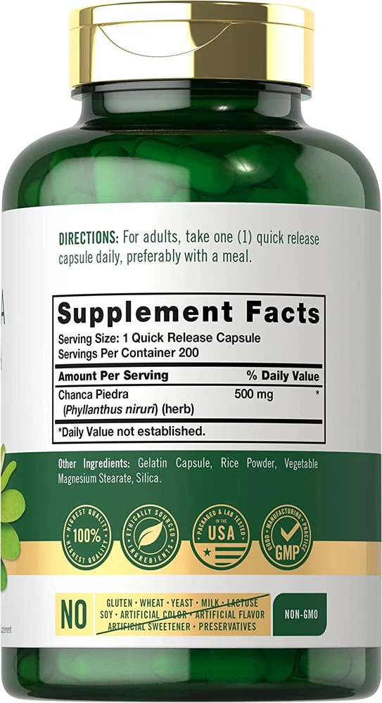 What is Chanca Piedra? Indigenous to the Amazon rainforest, Chanca Piedra ( Phyllanthus nirur ) is a traditional herb that has been a staple to Native American wellness practices for centuries. Originally, it was used to make herbal tea but today it comes in many forms. The whole plant, including leaf, root, and flowers are now common in herbal supplements such as liquid tinctures, liquid drops, powder, tablets, and other pill forms. Carlyle Chanca Piedra: Harness the power of nature today with Carlyle® Chanca Piedra! Our traditional herbal supplement features a premium 500 mg serving of this tropical plant in gluten-free and non-GMO quick-release capsules. It's the perfect source of plant-derived phytonutrients for any herbal wellness program. Carlyle Chanca Piedra — Rooted in Wellness: Our expertise in sourcing the purest ingredients combined with advanced technologies makes us proud to deliver premium, honest supplements at the best value. Carlyle's Chanca Piedra is a testament to our commitment to excellence, made with powerful ingredients rooted in wellness. Thanks for choosing us in your pursuit of living healthy. WARNING: Not intended for use by pregnant or nursing women. If you are taking any medications, including blood thinners, planning any medical or surgical procedure or have any medical condition, consult your doctor before use. If any adverse reactions occur, immediately stop using this product and consult your doctor. Not intended for use by persons under the age of 18. If seal under cap is damaged or missing, do not use. Keep out of reach of children. Store in a cool, dry place.