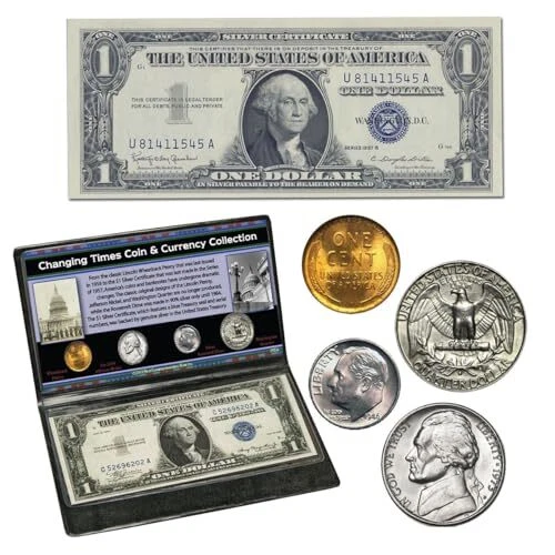 Return Policy Fast Delivery Trusted seller Changing Times Coin & Currency Set Product Description Modern coins and banknotes have changed dramatically over the last half century, and this collection features several items that were once commonly found in circulation but that have now disappeared and are incregly hard to find. Together, they bring back memories of bygone days. The coins and banknote are widely sought-after for their timeless designs and compelling stories. One of America’s most beloved coins is the Lincoln Wheatback Penny that was last made over 60 years ago in 1958. The back features two stalks of wheat, while the obverse is a portrait of Lincoln that is still used today. The original Jefferson Nickel was minted in 1938 to honor Thomas Jefferson, third President of the United States from 1801-1809, and it was last made in 2003 when the design changed. The obverse depicts a portrait of Jefferson based on a bust made in 1789 by French sculptor Jean-Antoine Houdon. The Roosevelt Dime was first made in 1946 and continued to be made in 90% silver only until 1964 (over half a century ago). It honors President Franklin D. Roosevelt, who guided America through the Great Depression and World War II. The coin in this collection is 90% silver. The original Washington Quarter was first issued in 1932 to honor the 200th anniversary of George Washington’s birth. The same portrait by John Flanagan is still used today, but the reverse has been State Quarters and National Parks Quarters designs since 1999, The $1 Silver Certificate was last made in the Series of 1957, and until June 24, 1968, it could be redeemed for the actual silver with which it was backed and that was deposited in the United States Treasury. It features a blue Treasury seal, unlike the green seal on today’s paper currency, to identify it as a Silver Certificate. The collection is presented in a custom coin wallet with narrative about the history and design of the items. Shipping Returns Payment Shipping Shipping is FREE to all addresses other than APO/PO boxes in the lower 48 states. All our stock ships from US-based warehouses. Shipped via USPS or UPS (depending on location and package weight) Unless stated otherwise, all orders will ship within 24-72 hours of your payment being processed. Check our feedback to see the great reviews of FAST shipping we offer. Returns Seller does not accept returns Payment We currently accept payment via eBay managed payments only. Once payment is cleared, we will dispatch your shipment within 1-3 business days. Please refer to the "Shipping" tab for more information regarding shipping speed to your destination.