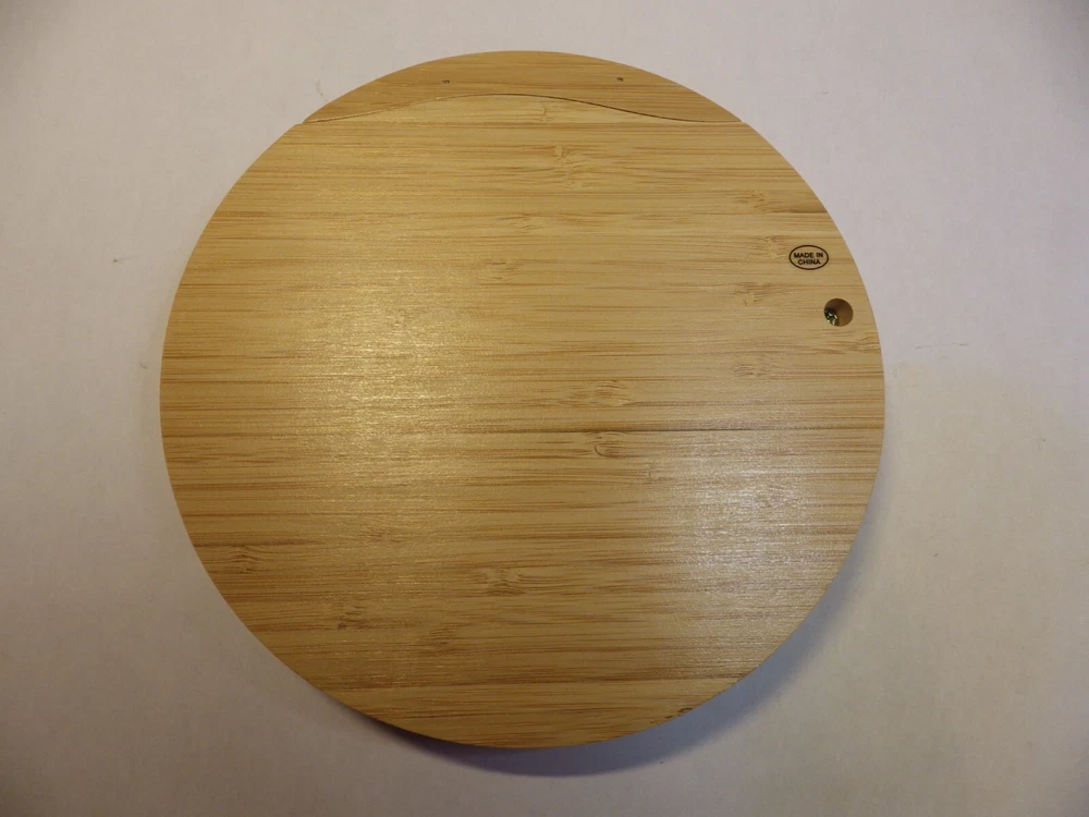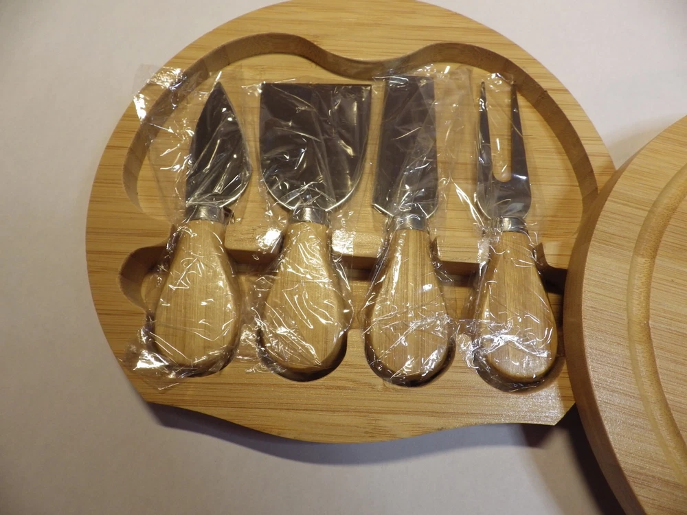 Cheese knife Serving Set with Bamboo box Set includes: Plane knife - for soft cheese Spatula - for cutting and shaving cheese Semi heart - for hard cheese Cheese fork Bamboo board style box Beautiful knife set with sustainable bamboo handles. Perfect for serving the family, guest or yourself! Great as a gift! Round storage box is 8 inches in diameter **I believe this may be a promotional item. At first I thought Crowell was the maker, but my research could not support that. Thank you, BBHM