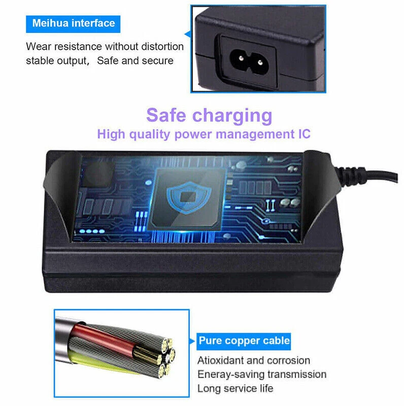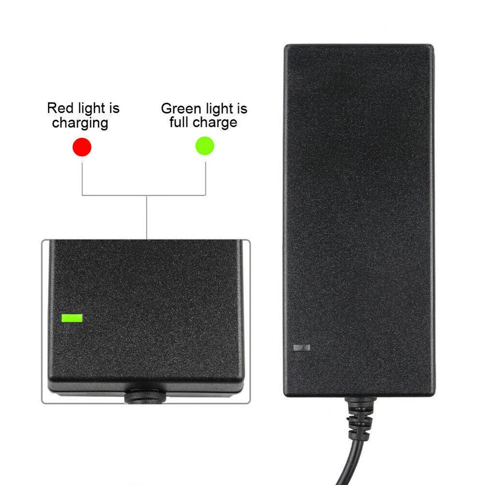 Description: *More portable size and long cable offer your more convenience when charging. *Buit-in LED Indication Ligh, easy to know the charging status: Green(full), Red(charging). *Mutil-Protection funtion: Overload protection/ Short-circuit/ Overvoltage protection. *Intelligent high-speed charging for most 42V versions scooters Specification: *Input: 100-240VAC, 50/60Hz, 1.5A (World Wide Use) *Output: 42V 2A (2000mA) *Power: 84W Max *US plug *DC interface:5.5 mm*2.1 mm *Product Size: Approx.11.8 x 5 x 3.2 CM *Safety Material: ABS Warm Tips: *Not suit for 24V batteries or lower. *Please make sure your battery charging port be compatible with the listing shows before purchasing. Product List: *1 x 42V 2A Battery Charger *1 x Power Cord On Oct 7, 2024 at 07:31:17 PDT, seller added the following information:
