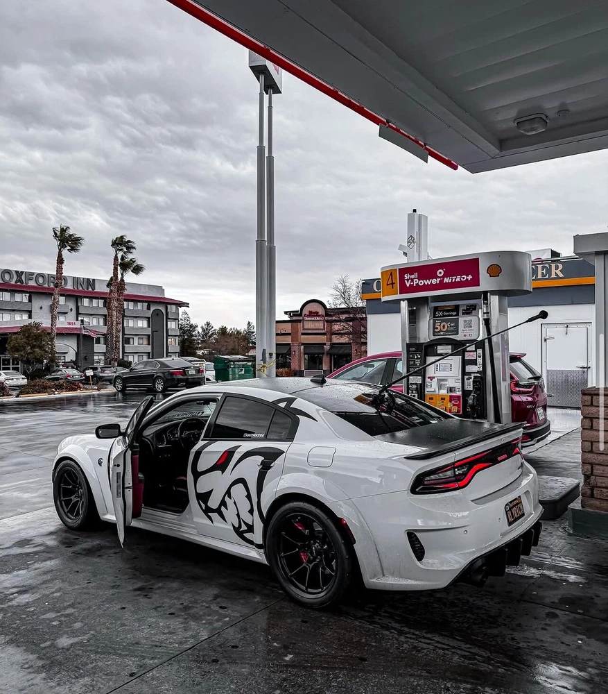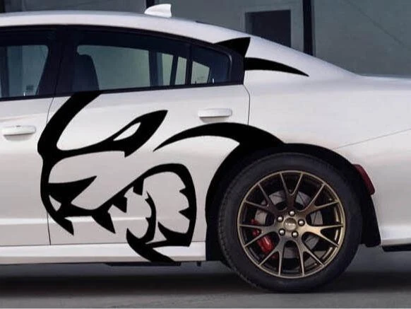 The product is a set of Charger/Challenger XL Rear Side Hellcat Decals designed for vehicles, particularly Chargers and Challengers. These decals are made of vinyl and are intended to be placed on the rear side of the vehicle. The design features a Hellcat motif on both sides, adding a graphic element to the vehicle's exterior. Perfect for those looking to customize their car with a sleek and unique touch.