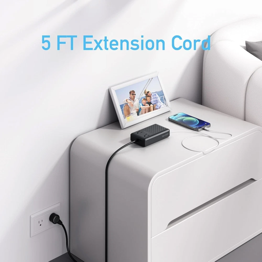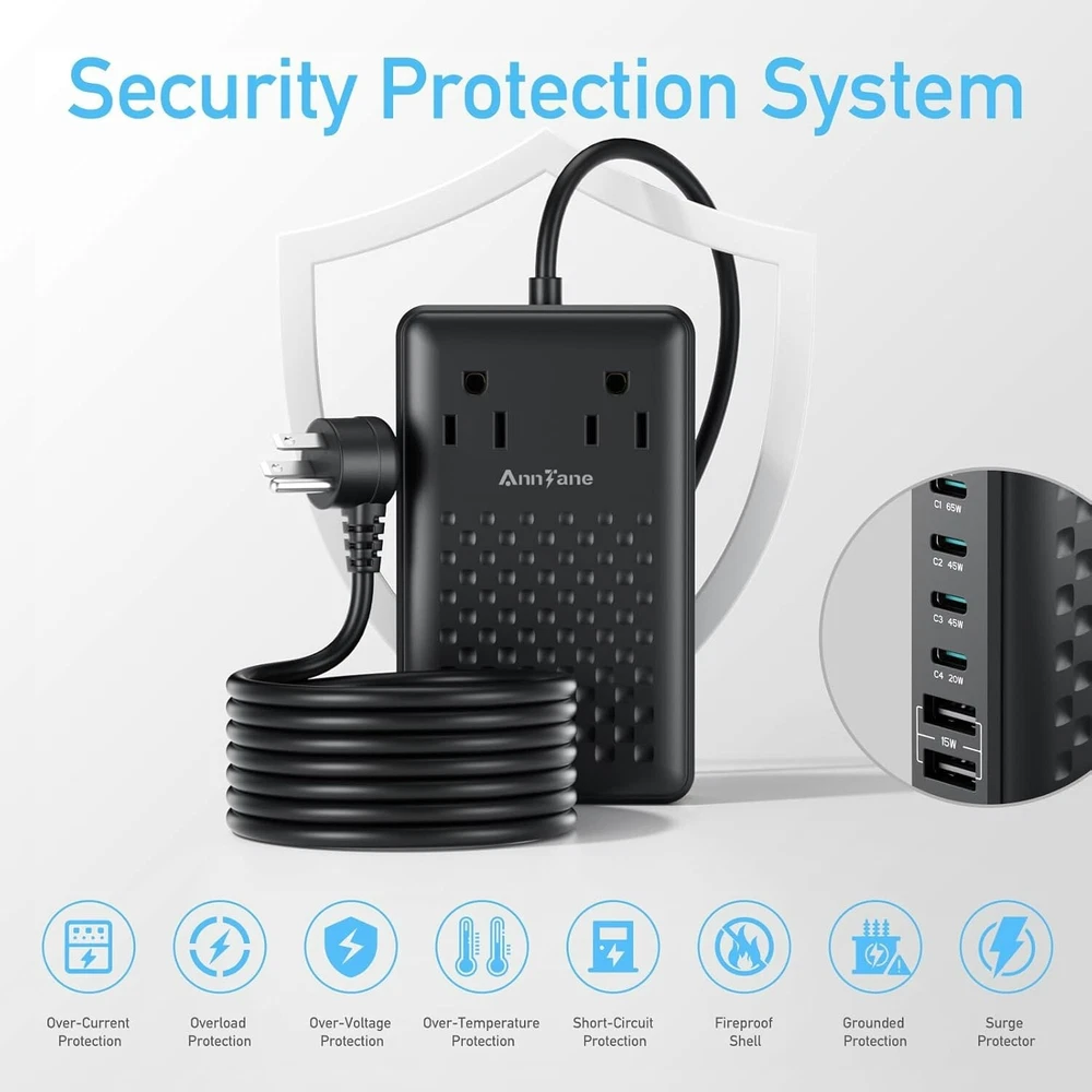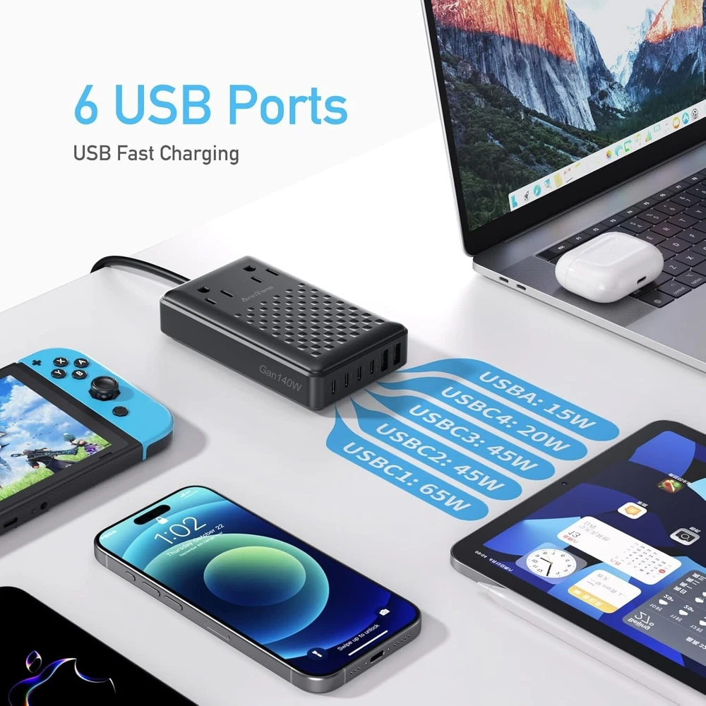 Charging Station 140W USB C Charger Block 8 Port Fast Charging Power Strip 5ft Flat Extension Cord with 4 USB C 2 USB A Ports 2 AC Outlets, Compatible with iPhone 15/14/13,MacBook Pro/Air Brand AnnTane Connectivity Technology USB+AC Connector Type 4USBC+2USBA+2AC Compatible Devices iPhone,MacBook,Laptop,Headphones,Game Consoles,Smartwatches Compatible Phone Models iPhone 15 / 15 Pro / 15 Pro Max / 14 / 14 Pro / 14 Pro Max / 13 / 13 Pro/ 13 Pro Max / 12 / 12 Pro /12 Pro Max iPhone 15 / 15 Pro / 15 Pro Max / 14 / 14 Pro / 14 Pro Max / 13 / 13 Pro/ 13 Pro Max / 12 / 12 Pro /12 Pro Max Special Feature GaN III technology Input Voltage 240 Volts Number of Items 1 Output Current 10 Amps Output Voltage 240 Volts About this item 【8 in 1 Charging Station】 This usb c charger with 4 USB-C ports (1 x 65W, 2 x 45W, 1 x 20W), 2 USB-A ports (2 x 15W) and 2 AC power outlets. It is charging station for multiple devices that can power up to 8 devices at the same time. 【140W USB C Charger Block】 The usb charging station adopts the latest GaN III technology, and the maximum output power can reach 140W when 6 USB ports are connected to the devices at the same time, which can be used for fast charging of mobile phones, tablets, laptops and almost all other devices! 【5FT Extension Cord】 This multiple charging station's 5FT power cord extends to desktops, bedside, counters, nightstands, service desks, and more. Product size: 5.04*3.02*1.18in. this usb power strip is easy to carry. 【Efficient and Convenient Usb C Charger 】Using USB-C1/C2/C3 ports of multi device charging station , you can charge your iPhone 15Pro up to 85% in just 40 minutes, increasing your productivity.