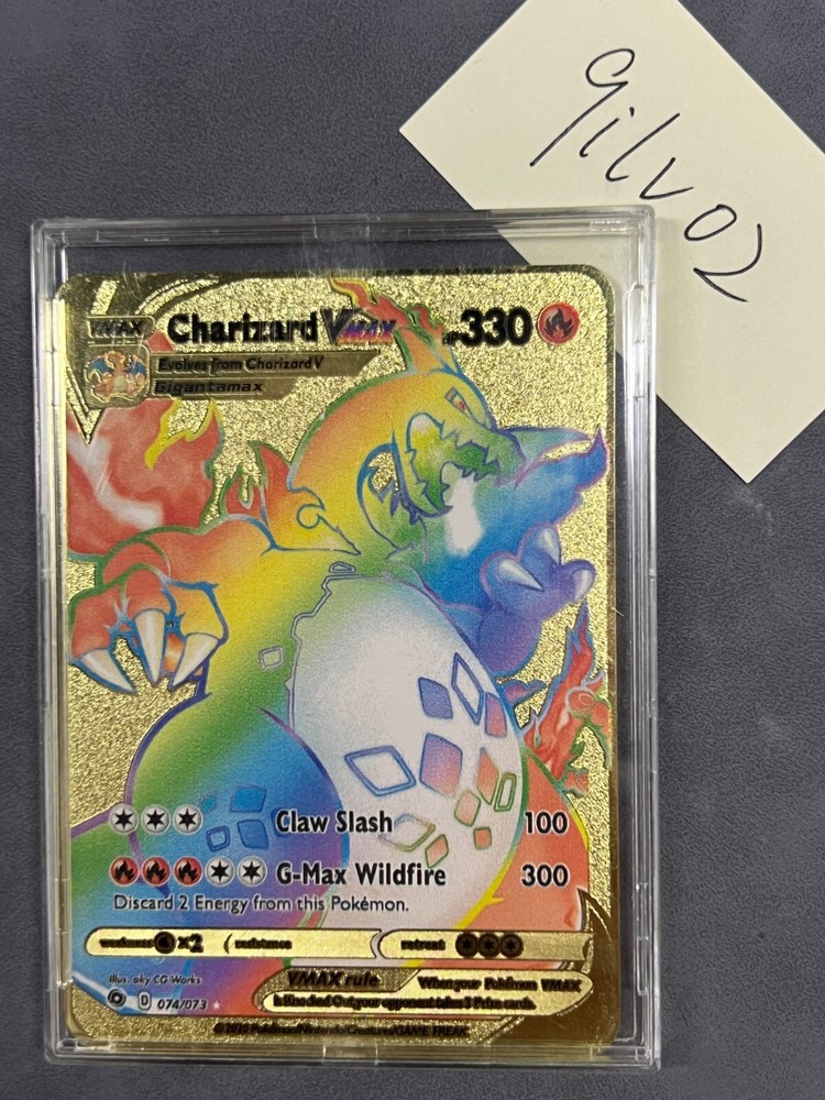 This Charizard VMAX Rainbow Gold Metal Pokémon Card is a must-have for any serious collector or Pokémon TCG player. With its stunning visual appeal, it's sure to catch the eye of anyone who sees it. The card features altered/custom art, making it truly unique and one-of-a-kind. The card is a Stage 2 Pokémon and has a finish of regular. It's in standard size and is made of metal. The card is in excellent condition and is perfect for display or gameplay. The card is in English language and is from the year 2022. The rarity of the card is gold, making it a highly sought-after item. Free express shipping Any question feel free to reach out and we will get back to you shortly. Thank you for your support!