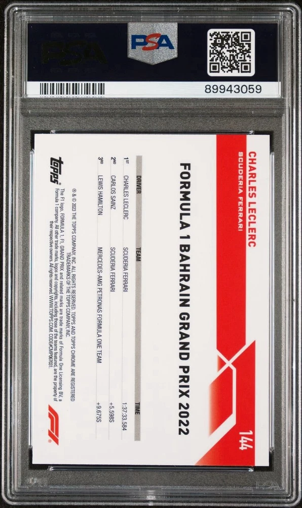 Type: Sports Trading Card Parallel/Variety: Gold Checker Set: 2023 Topps Chrome Formula 1 League: Formula 1 Card Number: 144 Player/Athlete: Charles Leclerc Team: Scuderia Ferrari Year Manufactured: 2024 Certification Number: 89943059 Grade: 10 Professional Grader: Professional Sports Authenticator (PSA) Season: 2023 Manufacturer: Topps Features: Parallel/Variety Sport: Auto Racing