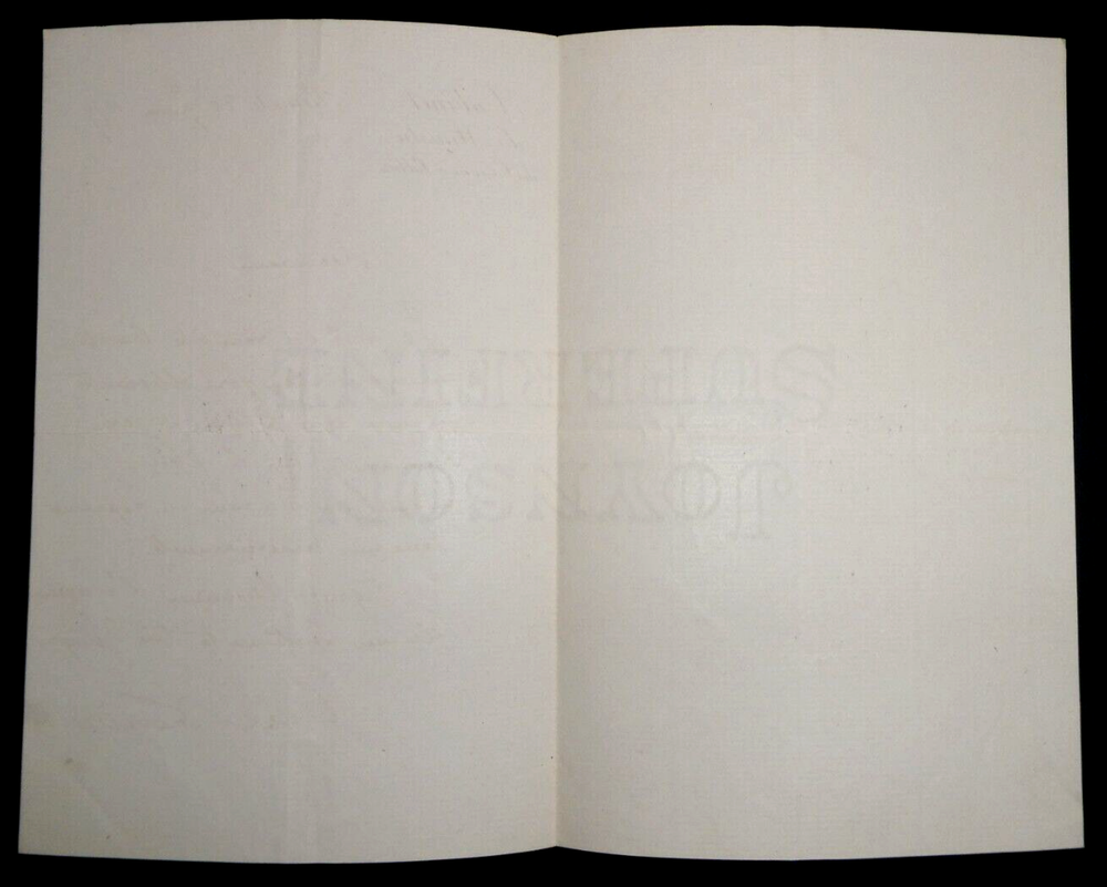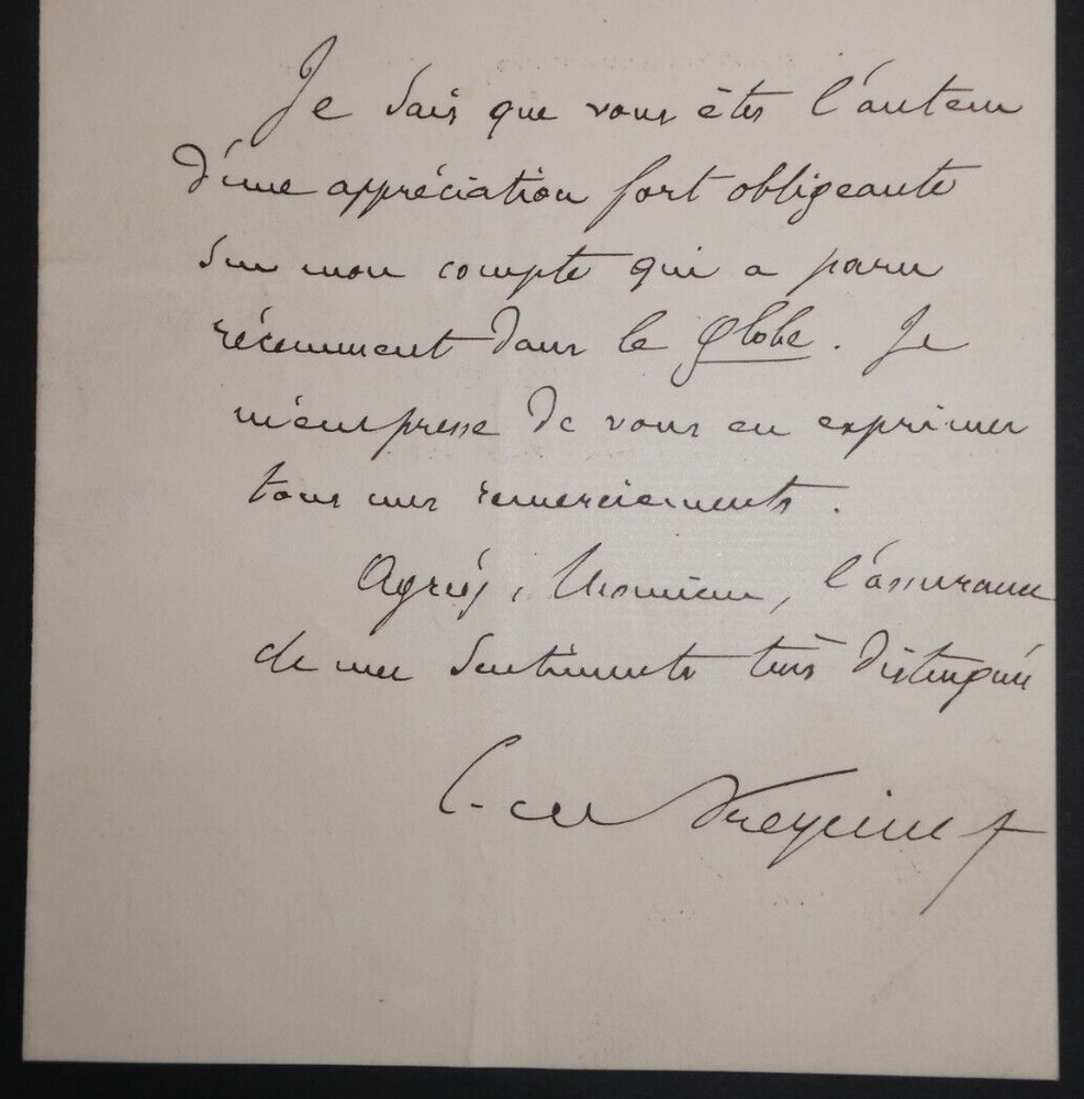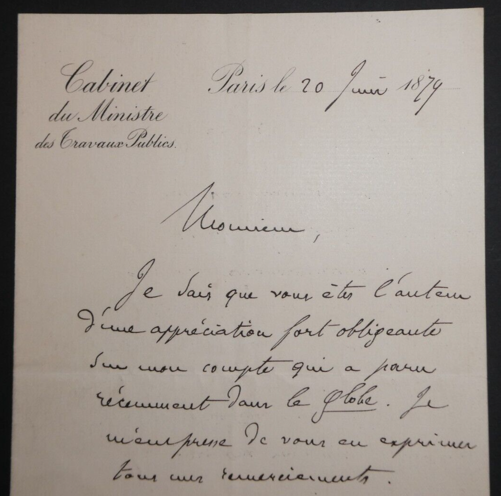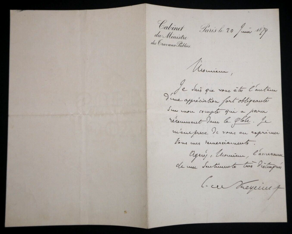 Lettre autographe signée de Charles Louis Saulces DE FREYCINET en date du 20 juin 1879 sur papier à en-tête "Cabinet du Ministre des Travaux Publics". Lettre de remerciements pour une appréciation dans la revue "Le Globe". État: Voir photos pour plus de détails. Dimensions : 11,4 x 17,7 cm. 1 page. Charles de Freycinet, né le 14 novembre 1828 à Foix et mort le 14 mai 1923 à Paris, est un homme d'État et ingénieur français. Wikipédia Envoi soigné dans un emballage rigide et étanche. Satisfait ou remboursé. Si vous n'êtes pas entièrement satisfait, je reprends la marchandise avec retour à ma charge pour l'Europe et à la charge de l'acheteur pour le reste du monde. N’hésitez pas à visiter ma boutique et affiner vos recherches en fonction des catégories qui vous intéressent. Ma boutique L'Art Délivré. Lettres autographes, vieux papiers, livres anciens, photographies, gravures, timbres… Nous expertisons et/ou rachetons dans toute la France vos lettres, collections de lettres et livres anciens. Merci de votre visite. Jérôme KAYSER. Lettre autographe signée de Charles Louis Saulces DE FREYCINET en date du 20 juin 1879 sur papier à en-tête "Cabinet du Ministre des Travaux Publics". Lettre de remerciements pour une appréciation dans la revue "Le Globe". Charles de Freycinet, né le 14 novembre 1828 à Foix et mort le 14 mai 1923 à Paris, est un homme d'État et ingénieur français. Wikipédia Si vous n'êtes pas entièrement satisfait, je reprends la marchandise avec retour à ma charge pour l'Europe et à la charge de l'acheteur pour le reste du monde. N’hésitez pas à visiter ma boutique et affiner vos recherches en fonction des catégories qui vous intéressent. Ma boutique Lettres autographes, vieux papiers, livres anciens, photographies, gravures, timbres… Nous expertisons et/ou rachetons dans toute la France vos lettres, coll