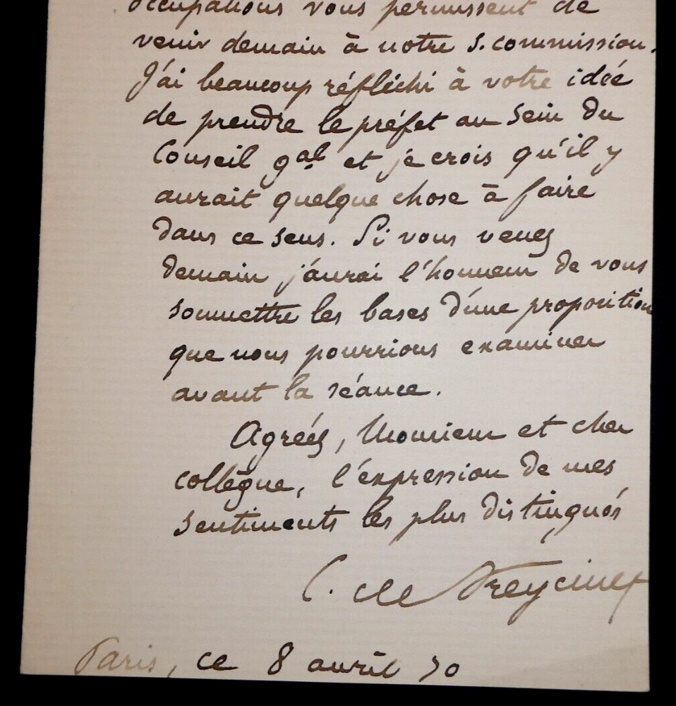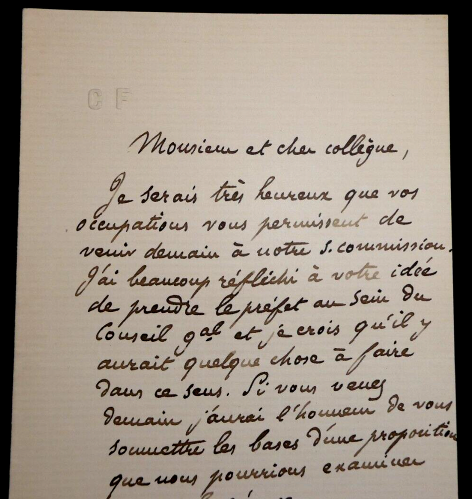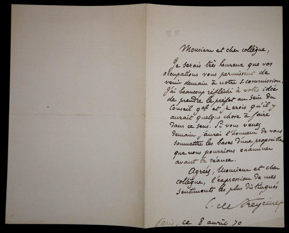 Lettre autographe signée de Charles Louis Saulces DE FREYCINET en date du 8 août 1890 avec monogramme à froid des initiales "CF". Lettre de une page dans laquelle il dit avoir beaucoup réfléchi à l'idée de son correspondant qui est d'intégrer le préfet au sein de leur conseil général et ne serait pas contre cette suggestion. État: Voir photos pour plus de détails. Dimensions : 13,2 x 21 cm. 1 page. Charles de Freycinet, né le 14 novembre 1828 à Foix et mort le 14 mai 1923 à Paris, est un homme d'État et ingénieur français. Wikipédia Envoi soigné dans un emballage rigide et étanche. Satisfait ou remboursé. Si vous n'êtes pas entièrement satisfait, je reprends la marchandise avec retour à ma charge pour l'Europe et à la charge de l'acheteur pour le reste du monde. N’hésitez pas à visiter ma boutique et affiner vos recherches en fonction des catégories qui vous intéressent. Ma boutique L'Art Délivré. Lettres autographes, vieux papiers, livres anciens, photographies, gravures, timbres… Nous expertisons et/ou rachetons dans toute la France vos lettres, collections de lettres et livres anciens. Merci de votre visite. Jérôme KAYSER. Lettre autographe signée de Charles Louis Saulces DE FREYCINET en date du 8 août 1890 avec monogramme à froid des initiales "CF". Lettre de une page dans laquelle il dit avoir beaucoup réfléchi à l'idée de son correspondant qui est d'intégrer le préfet au sein de leur conseil général et ne serait pas contre cette suggestion. Charles de Freycinet, né le 14 novembre 1828 à Foix et mort le 14 mai 1923 à Paris, est un homme d'État et ingénieur français. Wikipédia Si vous n'êtes pas entièrement satisfait, je reprends la marchandise avec retour à ma charge pour l'Europe et à la charge de l'acheteur pour le reste du monde. N’hésitez pas à visiter ma boutique et affiner vos recherches en fonction des catégories qui vous intéressent. Ma boutique Nous expertisons et/ou rachetons dans toute la France