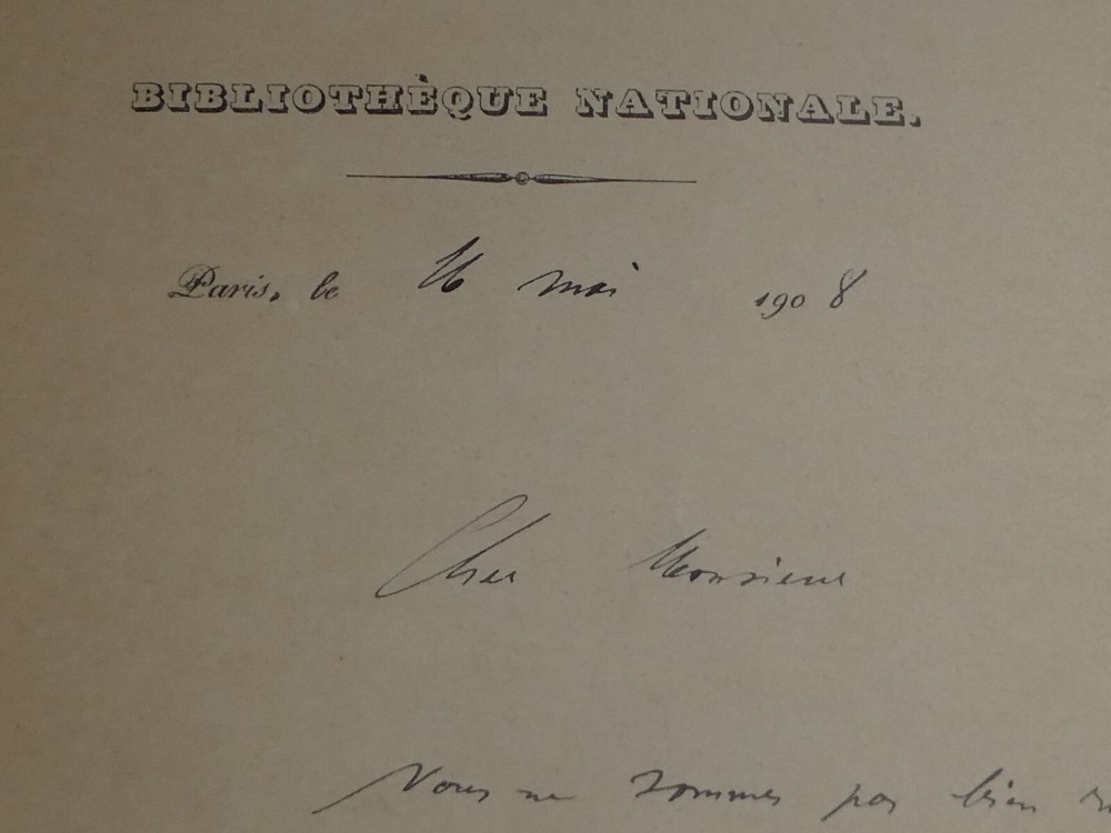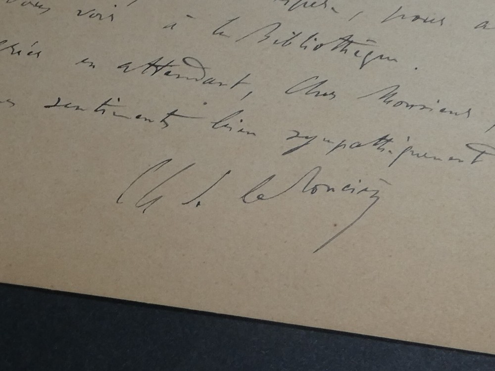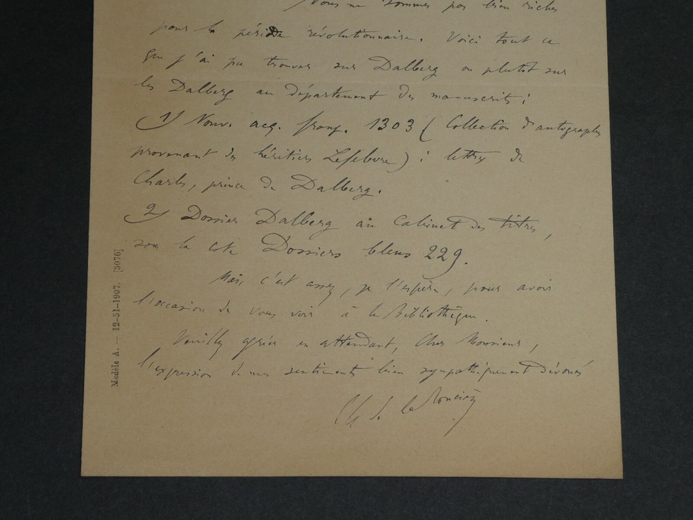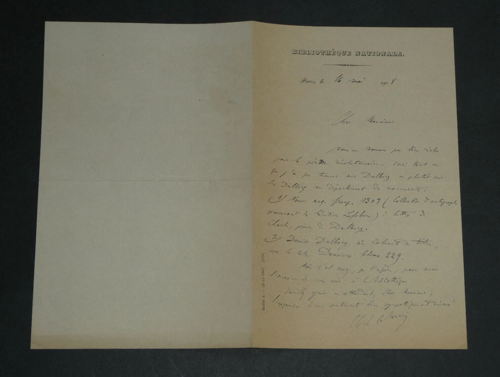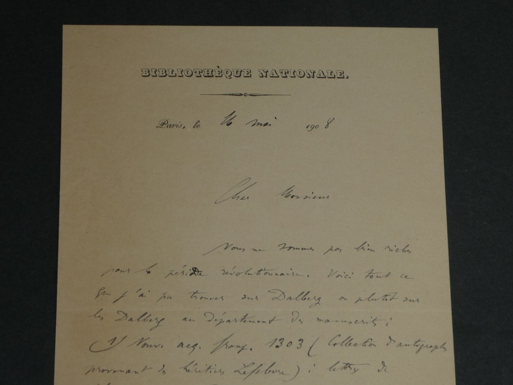 Free eBay listing template designed by dewiso.com Charles de La Roncière. Lettre autographe signée, 1908 Historien Lettre autographe signée de Charles De La Roncière, historien et bibliothécaire français, datée du 16 mai 1908, sur un feuillet double avec entête de la "Bibliothèque Nationale". Il fait part à son correspondant de ce qu'il a pu trouver sur Dalberg pendant la période Révolutionnaire. Dimensions : 13,5 x 20,7 cm État : Voir photos pour plus de détails. Nombre de pages : 1 page Charles de La Roncière Charles de La Roncière, né le 24 octobre 1870 à Nantes et mort le 15 juin 1941 à Gourin, est un historien et bibliothécaire français. Il a activement contribué au renouveau de l’histoire maritime en France. Wikipédia Contactez-nous Lettres autographes, vieux papiers, livres anciens, photographies, gravures, timbres... Nous expertisons et/ou rachetons dans toute la France vos lettres, collections de lettres et livres anciens. Paiement Sont acceptés les paiements par eBay, par PayPal, par virement ou par chèque. Envoi Envoi soigné dans un emballage rigide et étanche sous trois jours. Prévoir les délais postaux habituels en plus. Retour Satisfait ou remboursé. Si vous n'êtes pas entièrement satisfait, retour à la charge du vendeur pour l'Europe. À la charge de l'acheteur pour le reste du monde. Lettre autographe signée de Charles De La Roncière, historien et bibliothécaire français, datée du 16 mai 1908, sur un feuillet double avec entête de la "Bibliothèque Nationale". Il fait part à son correspondant de ce qu'il a pu trouver sur Dalberg pendant la période Révolutionnaire. Dimensions : 13,5 x 20,7 cm État : Voir photos pour plus de détails. Nombre de pages : 1 page