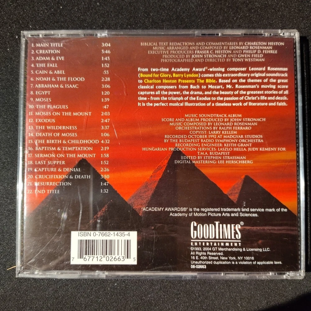 This audio CD features the soundtrack of Charlton Heston Presents the Bible Musical. The album includes very good (VG) graded CD and case, with an unknown artist contributing to the musical arrangements. The record label is GOOD Music, and the release title is unknown. This CD is perfect for fans of soundtracks and musicals, with a style that will transport them to the biblical era. The inlay condition is also very good (VG).