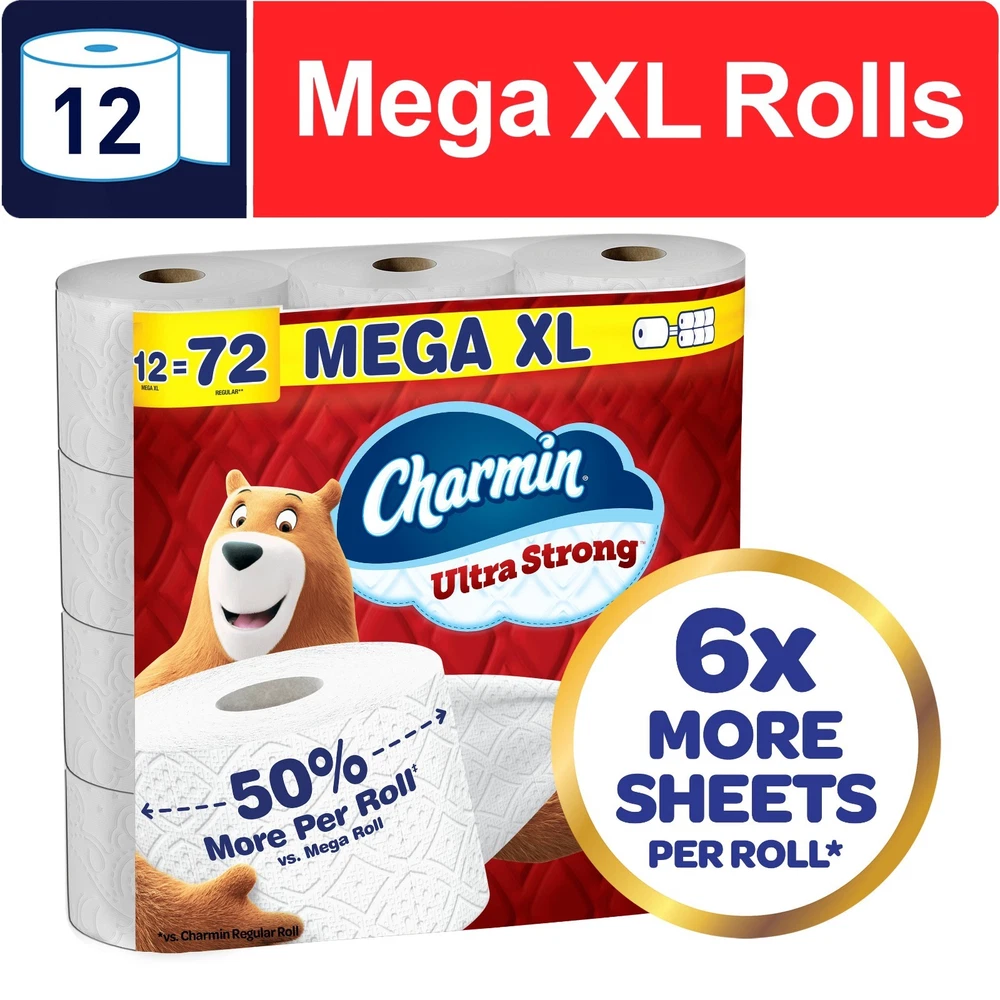 Product details Get your whole family clean with Charmin Toilet Paper Ultra Strong, 12 Mega XL Rolls. Charmin Toilet Paper Ultra Strong has a diamond weave texture that is 4X stronger when wet*. Our 2 plies clean better so you can use less (vs. the leading USA 1-ply bargain brand toilet tissue). We made our toilet paper roll Mega XL in size, so you get mega value. That's right, our Charmin Toilet Paper Ultra Soft Mega XL Roll equals 6 regular rolls (based on number of sheets in Charmin Regular Roll Toilet Paper), so you'll run out less often. Charmin Toilet Paper Ultra Strong is designed to be clog-safe and septic-safe so you can flush confidently. We all go, why not enjoy the go with Charmin Toilet Paper Ultra Strong? Pack contains 12 Mega XL Rolls (330 Sheets Per Roll) of Charmin Toilet Paper Ultra Strong Charmin Toilet Paper Ultra Strong Mega XL has more sheets than Mega Roll, so you can run out less often Charmin Toilet Paper Ultra Strong has washcloth like texture 4X stronger when wet to keep you clean vs leading USA 1-ply bargain brand Made with a diamond weave texture Clog-safe and septic-safe; Roto-Rooter approved Charmin Toilet Paper Ultra Strong Cleans Better with fewer sheets and less effort vs. leading USA 1-ply bargain brand 1 Mega XL Roll = 6 Regular Rolls based on number of sheets in Charmin Regular Roll bath tissue