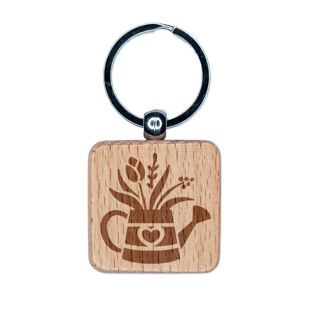Charming Water Can Spring Summer Flowers Gardening Engraved Wood Square Keychain