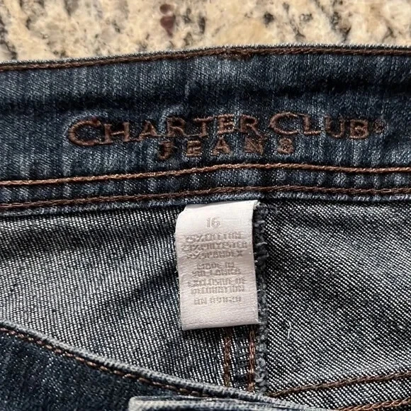 Get ready to rock your fashion game with these Charter Club Women's Jeans in a medium blue wash. These jeans feature a flattering mid-rise fit with a modern straight cut and a cropped length that is perfect for any season. The 5-pocket design includes a zip and button closure for easy wear, while the studded, embroidered, and button accents add a touch of personality. Made from a comfortable and breathable cotton blend with a dark wash, these jeans are easy to care for and also have shaping and stretch features for a flattering fit. Complete with a belted waist and a solid pattern, these jeans are a classic and versatile addition to any wardrobe. Don't miss out on this must-have piece from the Charter Club line. very Light faded Otherwise very good pre owned condition 75% cotton 23% polyester 2% spandex stretch denim machine washable 36’ around waist inside button 43’ around hips 11.50’ front rise 25’ leg inseam 16’ around leg bottom nice for Spring and Summer