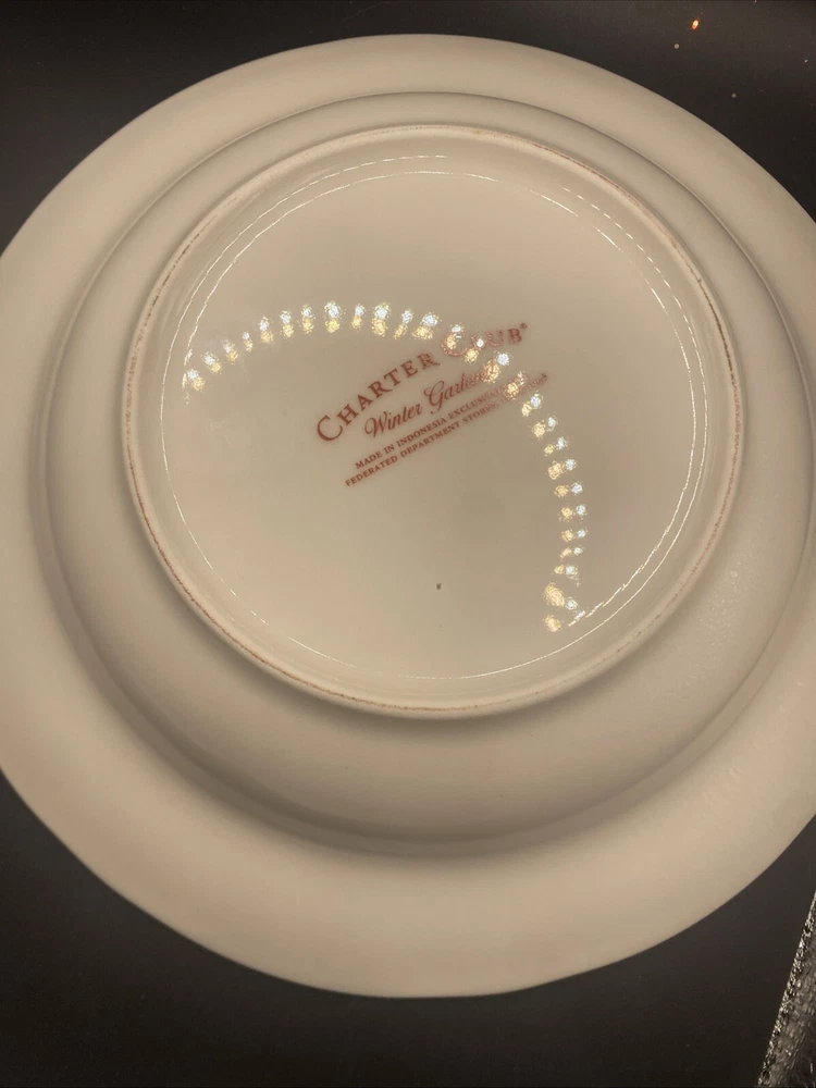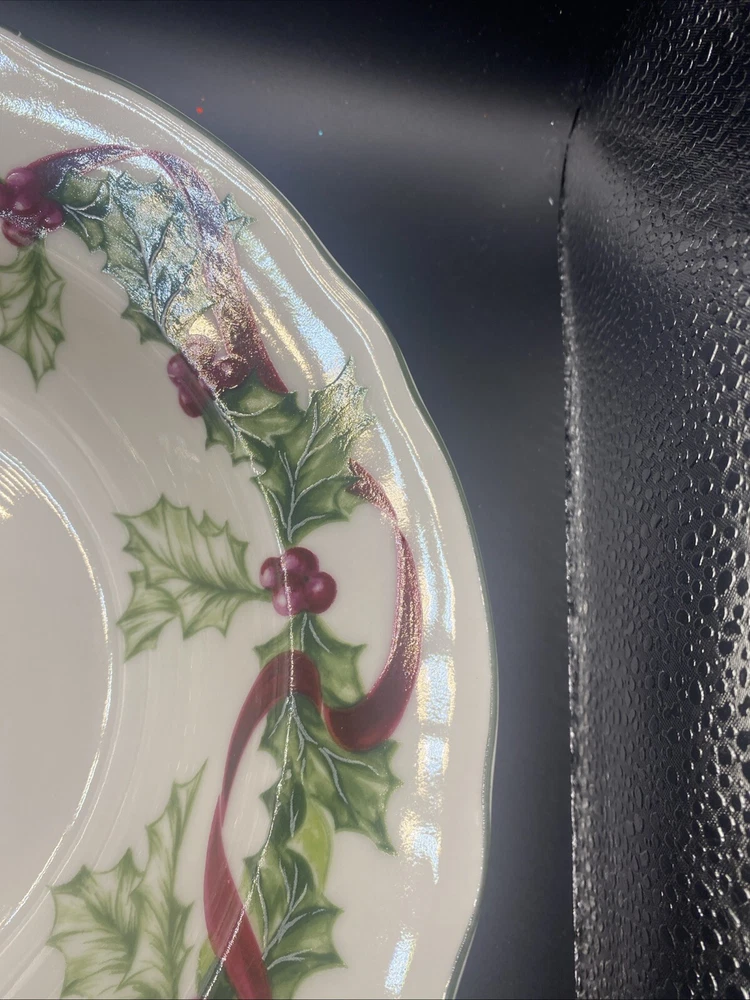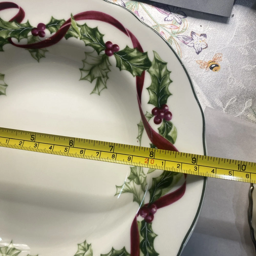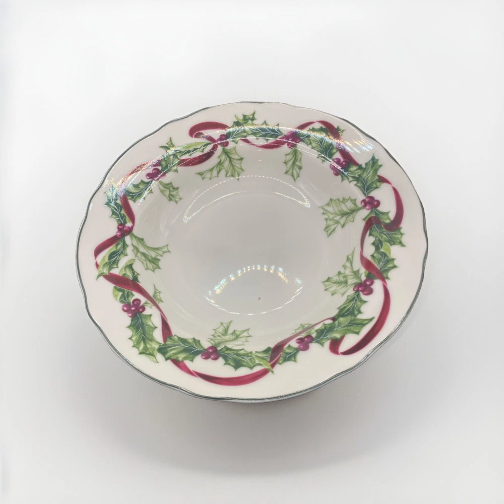 Add a touch of elegance to your holiday table with this Charter Club China Winter Garland rimmed pasta bowl. The intricate Holly and Ribbon pattern is a classic design that will complement any Christmas theme. Made in Indonesia, this bowl is perfect for serving soup or pasta and is a great addition to your dining collection. Crafted from high-quality china, this bowl is a vintage piece from the 1990s and features a Tiffany-style theme. The art pottery production style and technique make it a unique and beautiful piece. This set includes one pasta bowl and is a part of the Winter Garland product line.