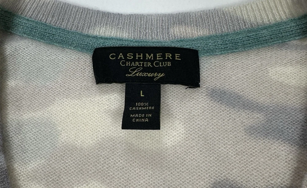 Charter Club Luxury 100% Cashmere Light Grey Camouflage Vneck Large • Size: Large • Condition: VERY GOOD - Previously worn, with only minor visible flaws and/or minor wash and wear. All seams are firm. Moderate fuzz formation or pilling possible. • Item Specifics: Small stain on back trim. See photos with blue circle outlining the stain. • Color: Light grey tones *Due to photographic lighting sources and inconsistencies in various monitor settings, we cannot guarantee that the color you see accurately portrays the true color of the product. Furthermore, every individual may see these colors differently. Please view the 1st image for a more accurate image of the item's color.* Make an Offer and Save! We believe in fair pricing and want you to get the best value. If you’re interested, simply submit your offer and we’ll consider it. It’s a great chance to snag this product at a price that works for you. Send us your offer now!