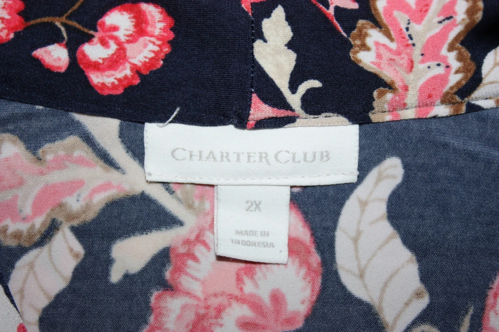 Welcome to Pim's clothing sales Excellent condition lightweight blouse. Stretch fabric. 3/4 sleeve Brand: Charter Club Material: 95% Polyester 5% Spandex Size : 2X tagged Bust: 23 armpit to armpit Shoulders: 16 Length: 28 back of collar to hem (Ask if you need more measurements) Please Remember all Clothing Items may fit differently depending on Brand, Fit, Use or Prior customization. We strongly urge our customers to check measurements first to guarantee proper fitting. Please be sure to check out our listings frequently for more high quality Designer Brand clothing items at a fraction of the price. We are getting new inventory all the time! You never know what amazing deals you may find :) Shipping discounts will be provided for multiple purchases - Please contact us after multiple purchases for an updated invoice.