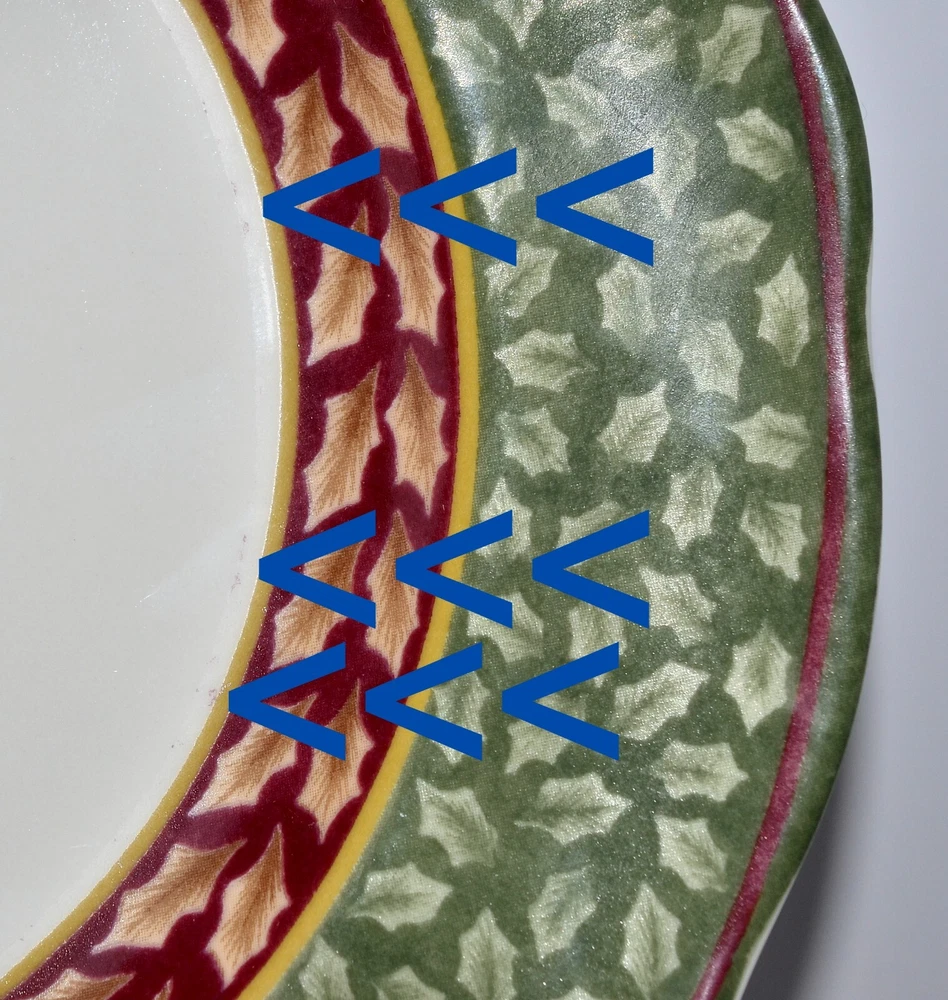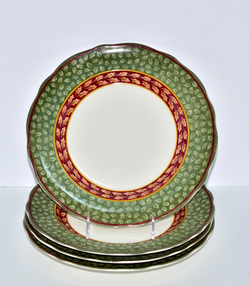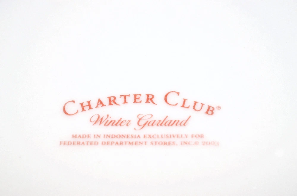 Charter Club Winter Garland - Four accent dinner plates - 11" diameter - Gently used with no chips or cracks.... There are a few issues.... a little wear on the inner burgundy leaf area of one plate from utensils, a little burgundy glaze on the white area of one plate and a teeny-tiny dark speck on the white are of another plate..... SEE ALL PHOTOS. SHIPPING: Your package will be sent within one business day of your payment. Your items will receive superior packaging to ensure a safe arrival.