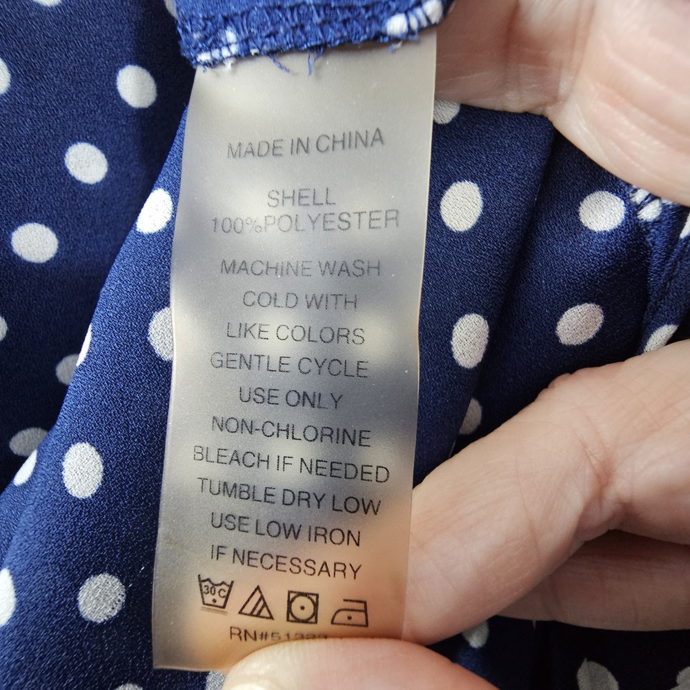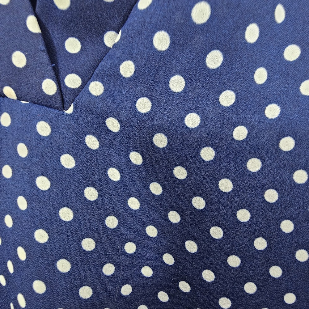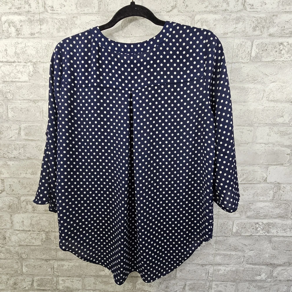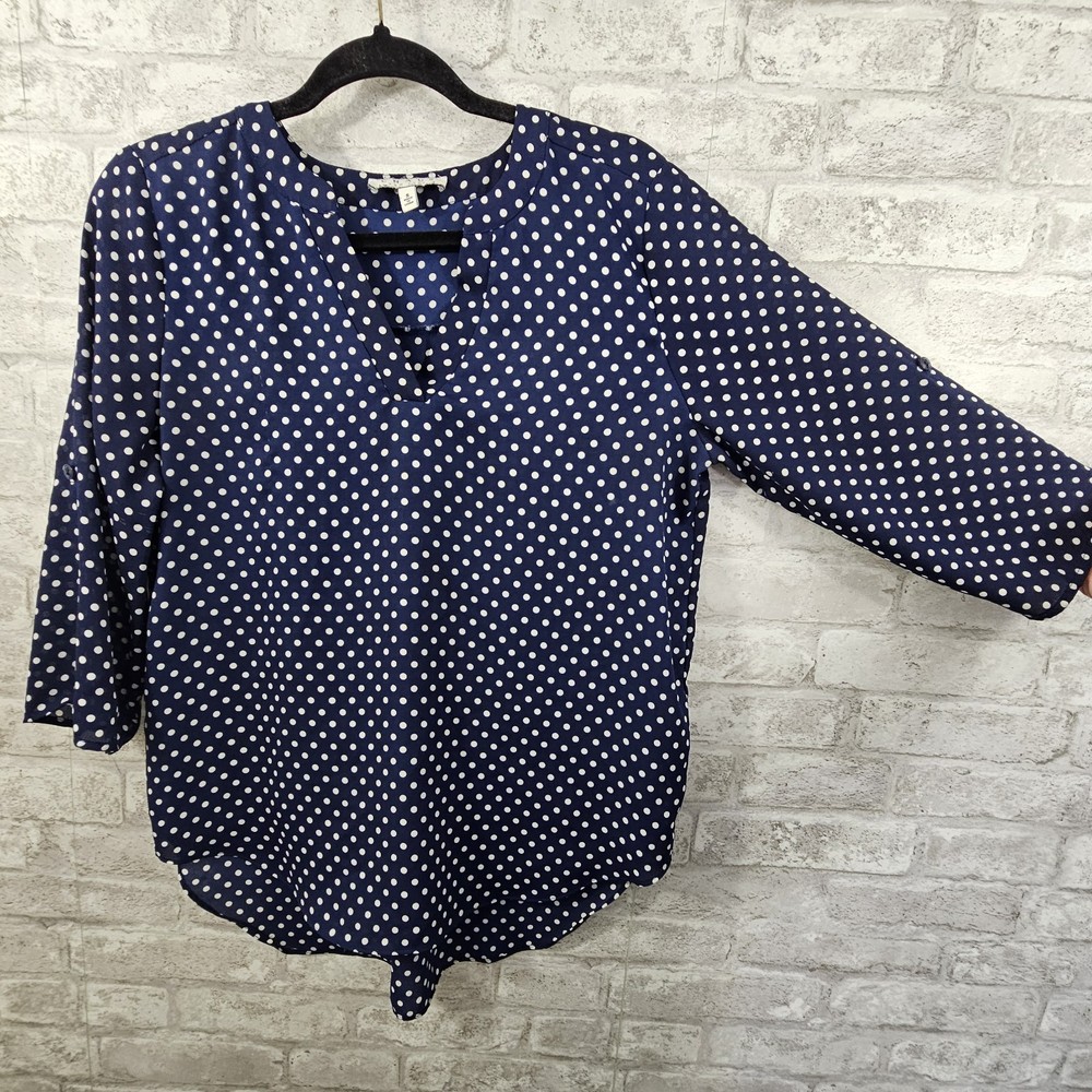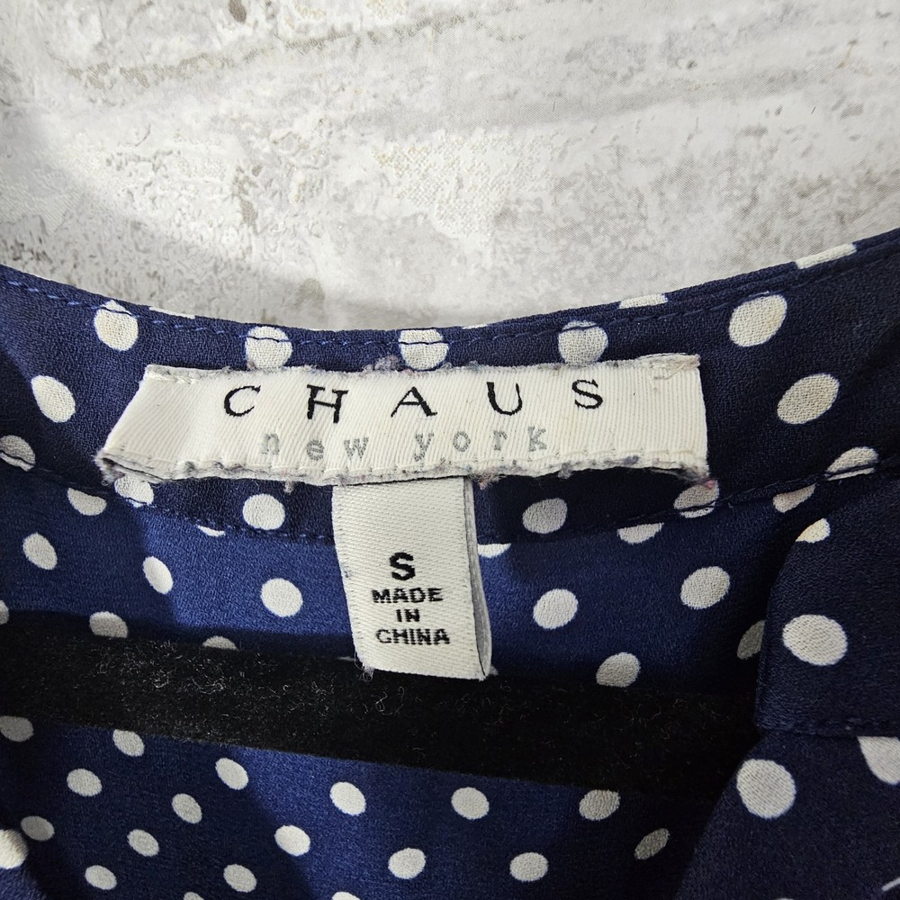 Chaus New York Blue White Polka Dot Top Blouse Women's Size Small. Excellent pre-owned condition. No rips, tears or stains. See photos for best representation. Measures: Length 25.5" Width pit to pit 20" Sleeve 17.5"