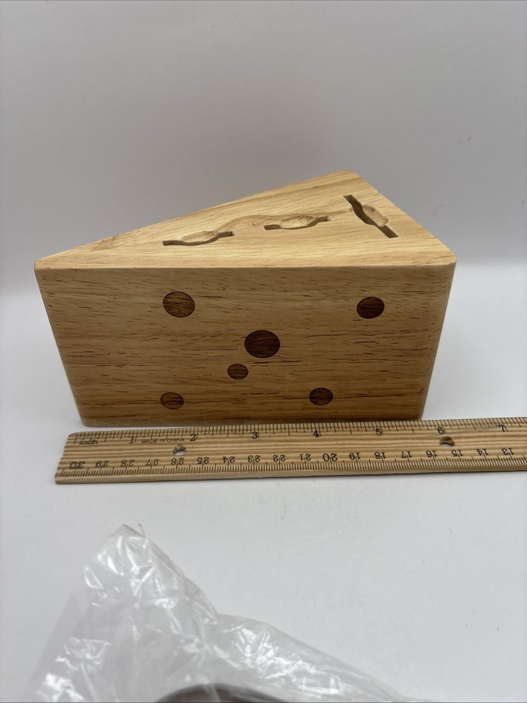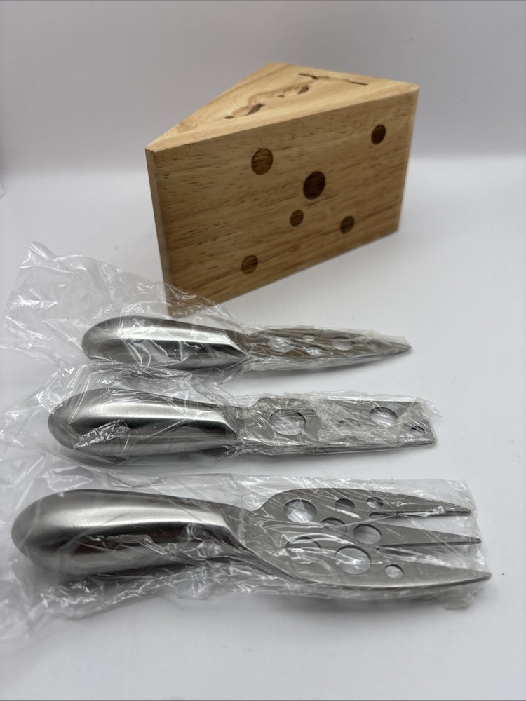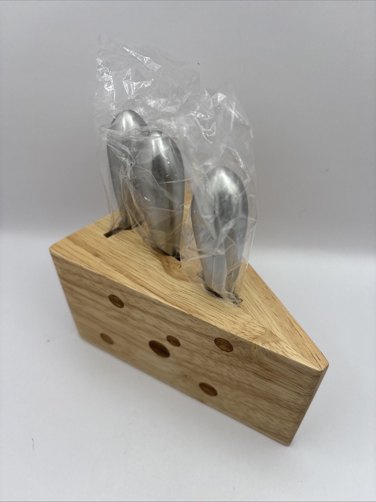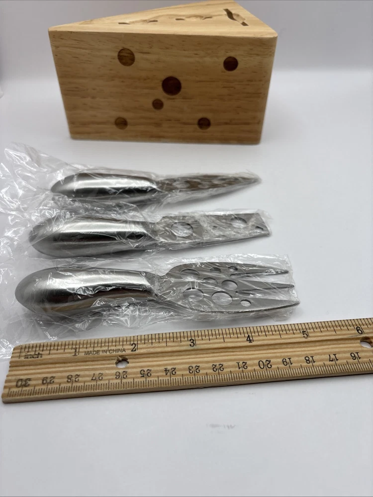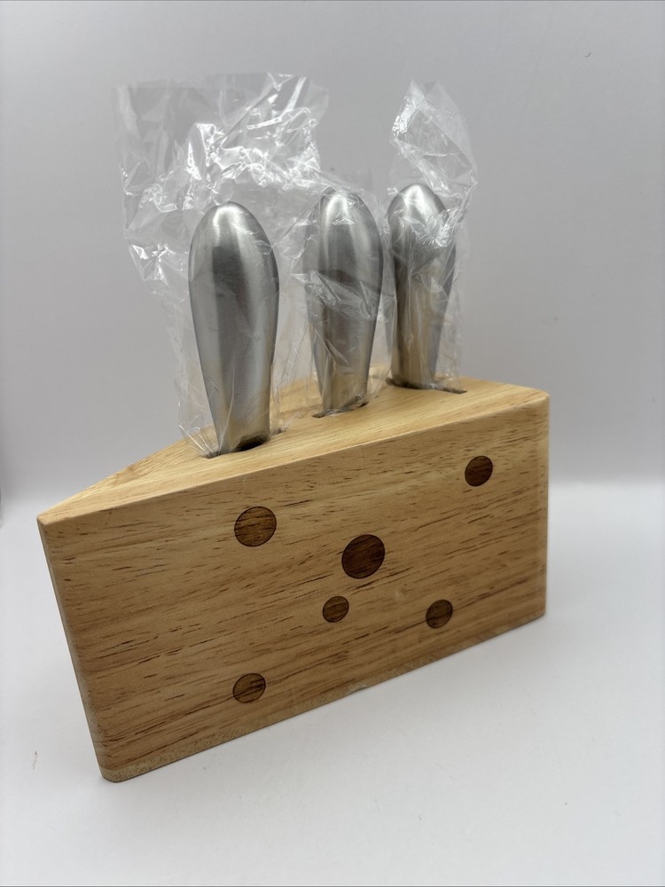 This is a wood block in the shape of a wedge of Swiss cheese with 3 cheese serving utensils. Items appear to be unused. Set includes 1 wood block along with 3 utensils.