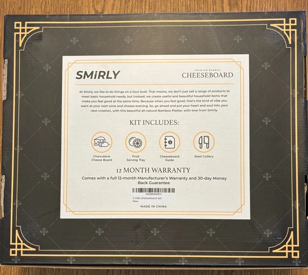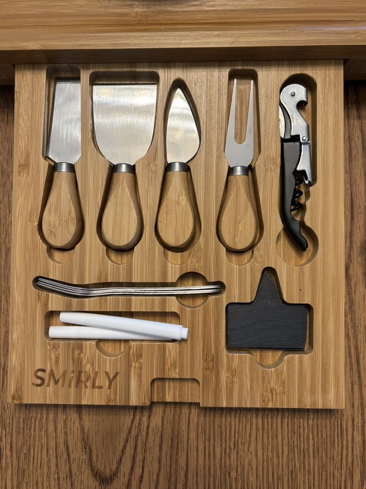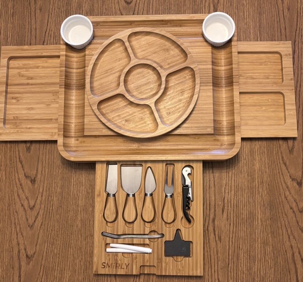 Great for holiday parties and gathering. High quality and sturdy. If you’re going to put out some fancy meats and cheeses for your guests why not have something beautiful to present them. This charming SMIRLY Cheese Board and Knife Set is a must-have for every cheese lover. The set includes a medium-sized bamboo cheese board and a matching knife, perfect for effortlessly slicing through your favorite cheeses. The set is not only functional but also stylish, making it an ideal addition to any kitchen or dining room. Crafted from high-quality bamboo, this cheese board set is durable and long-lasting. The set is perfect for entertaining guests or simply enjoying a small snack of cheese. With its elegant design and sturdy construction, this cheese board set is sure to become a favorite in your home.