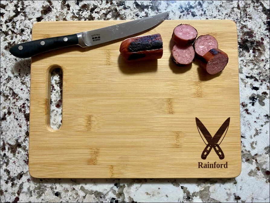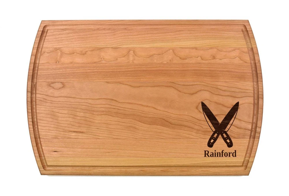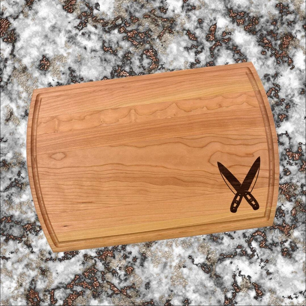 Design: Personalized Chef Knives Cutting Board or Charcuterie Serving Tray All items ship via USPS - please make sure your address is correct :-) Whether used as a charcuterie serving tray for snacks or cutting board, our bamboo, walnut and cherry custom boards are the perfect addition for the home and make the perfect gift for your loved one celebrating a birthday, anniversary, new home, wedding, etc! *** FEATURES *** • SIZES: We have multiple styles and sizes available. To see our current sizes available, click the drop-down menu. The photo slide contains a photo showing each side by side. Please note, the board with the juice groove only has the groove on the front side of the board. • THICKNESS: Bamboo Boards - Approximately 1/2" Thick; Walnut & Cherry Boards - Approximately 3/4” Thick • UNIQUE: Every board is unique with the grain and coloring varying throughout - no board is the same! • CARE INSTRUCTIONS: Hand wash only with warm water. Do not soak. Please apply mineral oil throughout the board’s life. • PERSONALIZATION/CUSTIMIZATION: Do you want the text placed differently on the board? Please don’t hesitate to contact us. All personalization notes can be entered in the personalization box when checking out. • SHIPPING: All cutting boards ship within 2 to 5 business days. • WHOLESALE ORDERS: Please don’t hesitate to contact us for information about wholesale orders. Processing times for larger orders may change. • NOTE: Colors can vary a bit on different monitors and screens. Any props included in photos are not included. Please be sure to double-check your address to make sure it is accurate for USPS delivery. If a package is returned to us due to an invalid address, the buyer is responsible for all additional shipping charges. We appreciate you supporting small business – best wishes! For items ordered with simple edits, we do not send proofs since the layout doesn't change from the example(s). However, in the event there are requests that change the layout from the example(s), we do send proofs for approval before making the product. If you'd like a proof before we make the product, please note so in the personalization box.