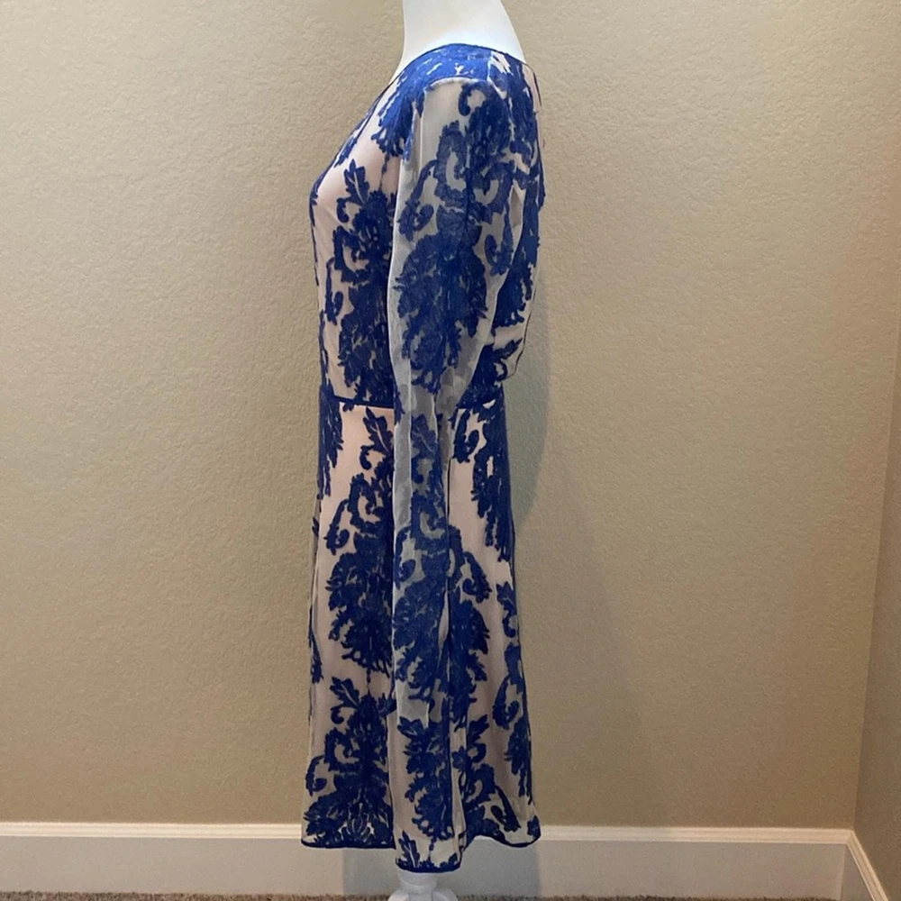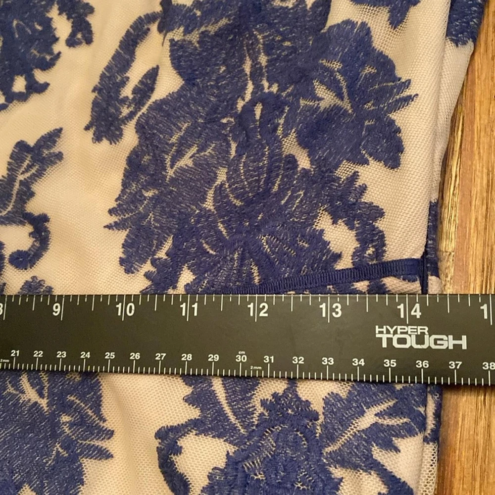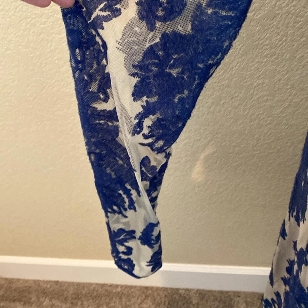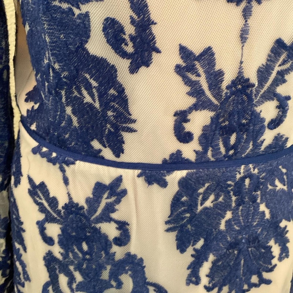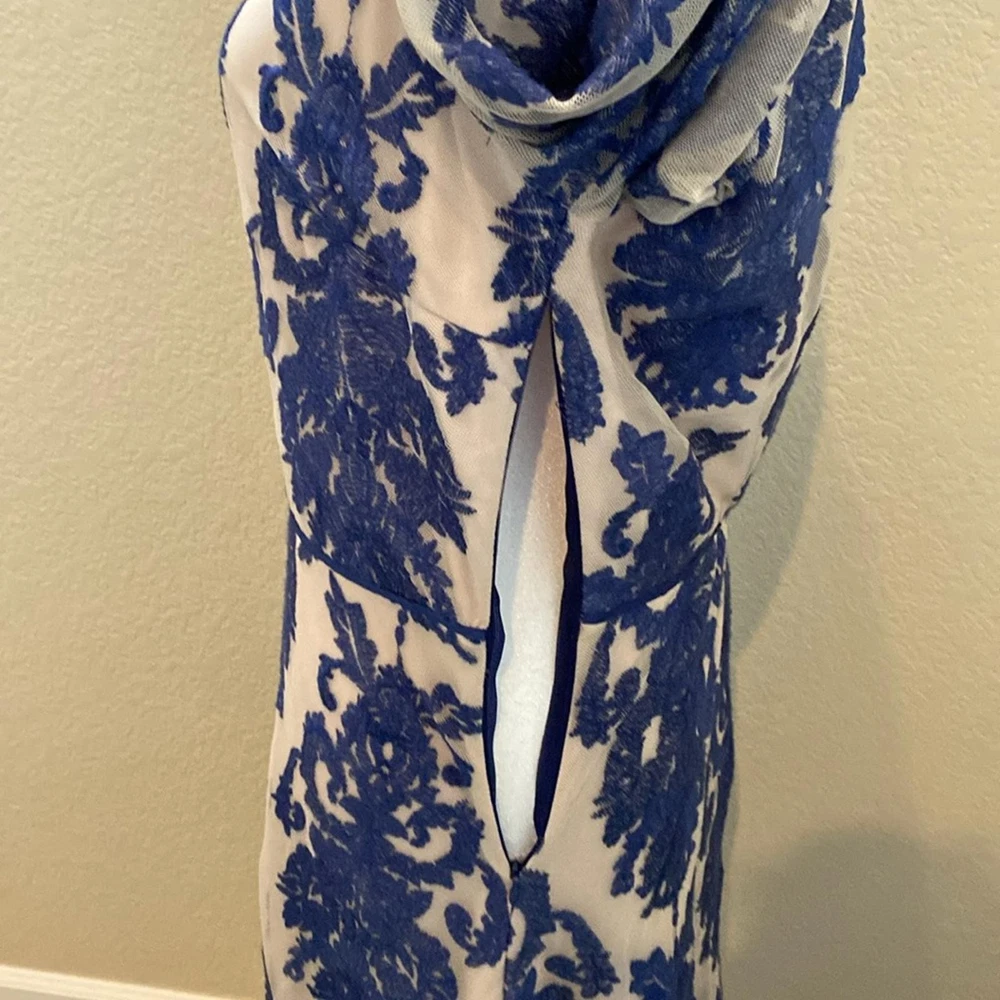 This elegant dress features a stunning blue pattern on a cream background, perfect for any occasion. The flowing design offers both comfort and style.